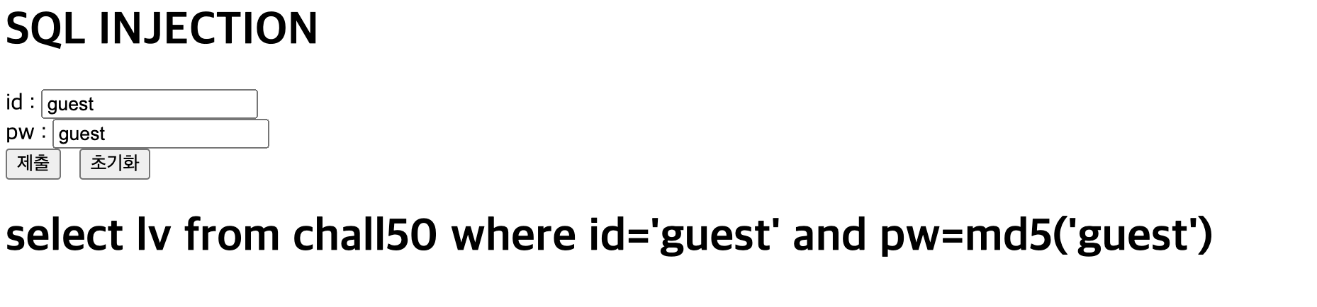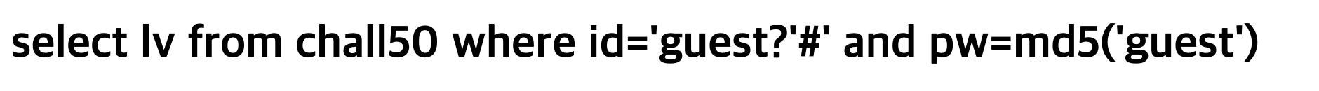 일단 나는 SELCT lv FROM chall50 WHERE id='guest'#' and pw=md5('guest')를 하여, id 파라미터으로만 lv를 출력하는 것을 목표로 잡았다.
