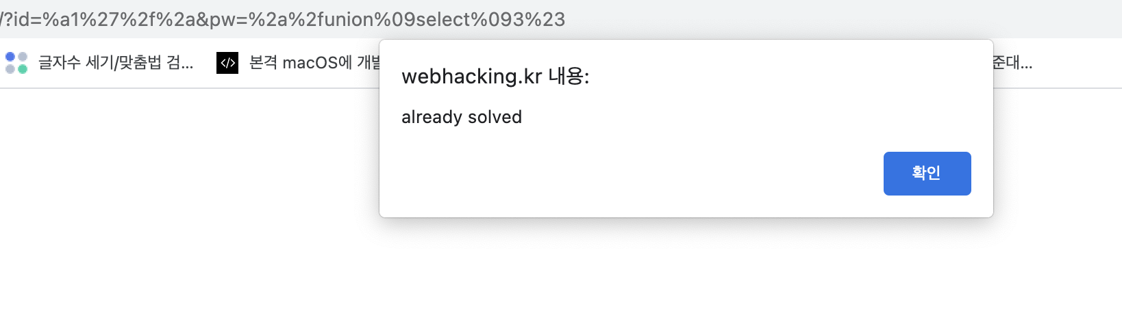 Union을 사용하기 위해 id 파라미터는 union에 대한 검증이 있으므로, pw 파라미터를 이용하기로 하였다.