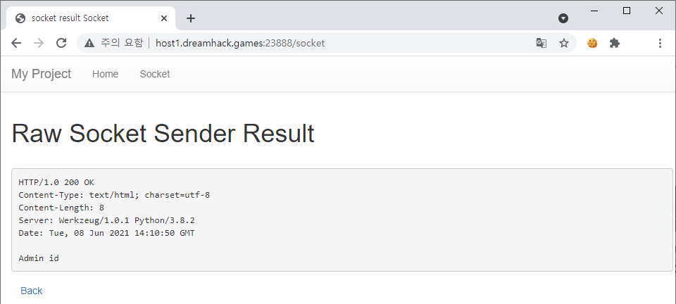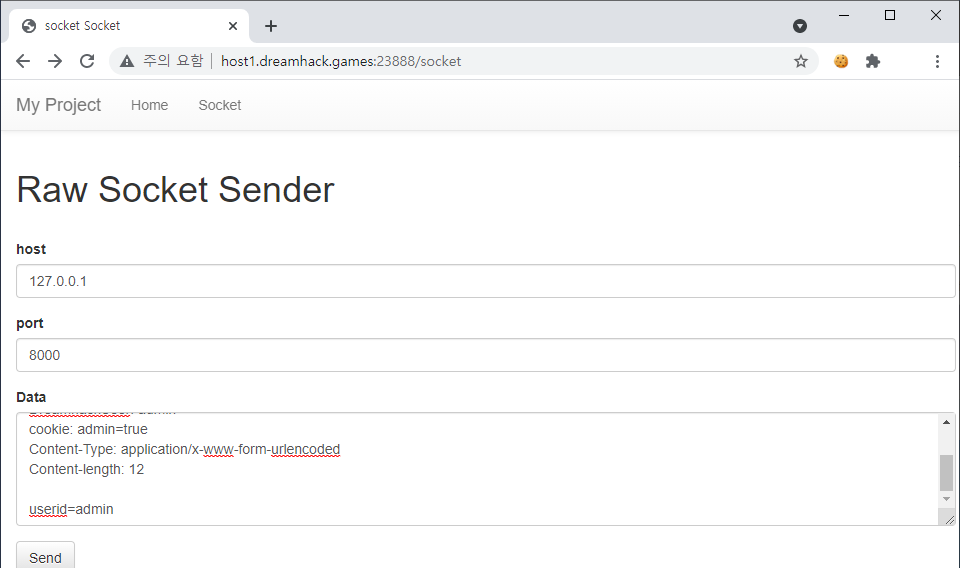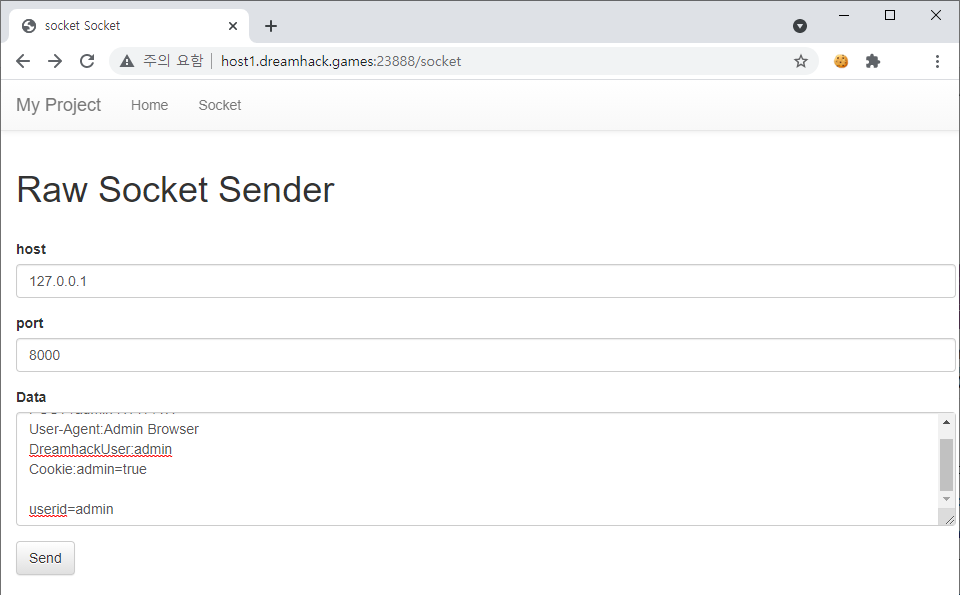 Raw Socket Sender를 이용하여 로컬 단에서 admin 페이지에 Data를 전달하도록 한다.