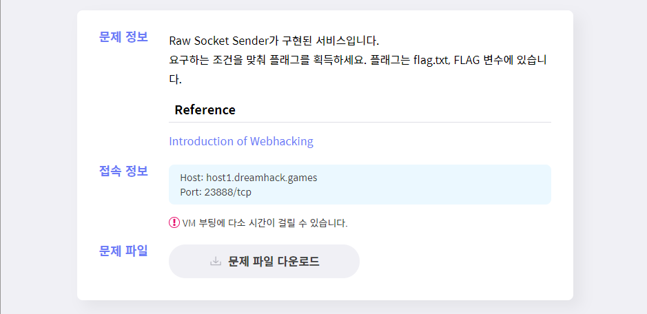 Raw Socket Sender가 구현된 서비스에서 요구조건을 맞춰서 플래그를 획득하라고 한다.
