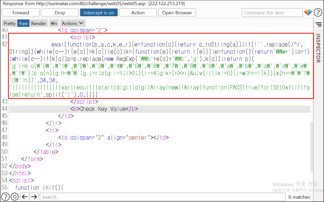 응답 값 내 eval 함수 대신 document.write()함수를 이용하여 난독화를 풀어 보았습니다.