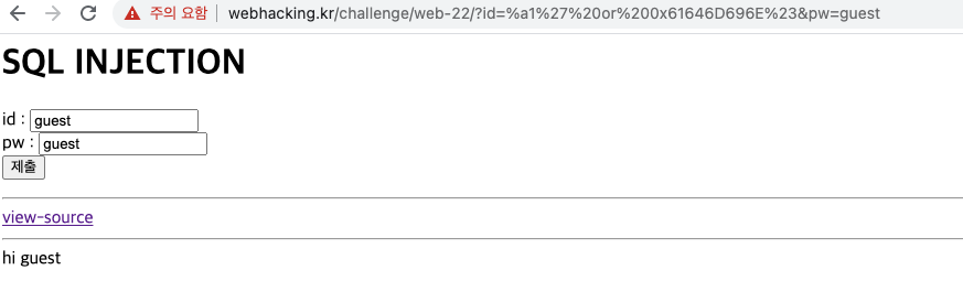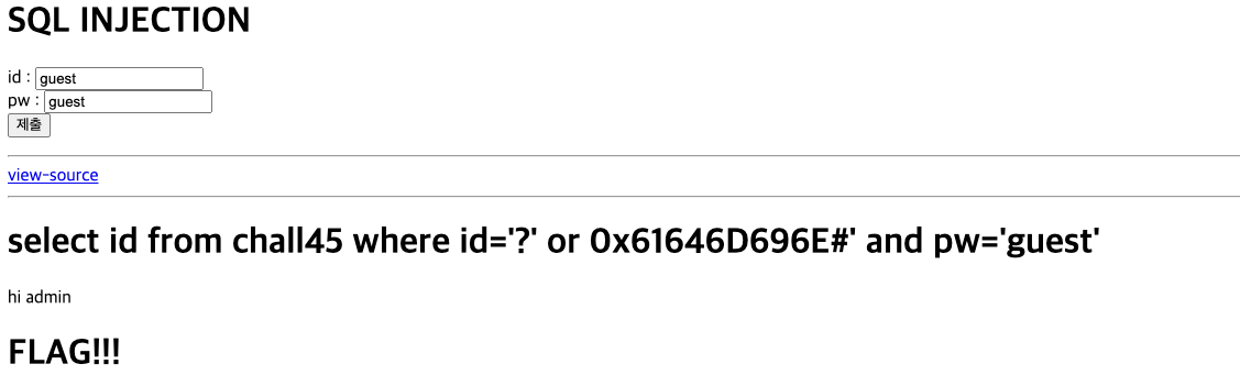 이를 해결하기 위해선 SELECT id FROM chall45 WHERE id=‘?’ or id=0x61646D696E;와 같이 id를 지정하면 되는데, 해당 문제에선 =을 검증하고 있기 때문에 LIKE로 우회하여 사용하겠다.