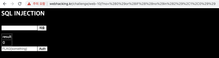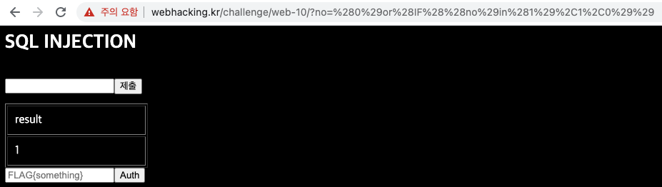 왜냐하면, 이렇게 하면 chall13 테이블의 no 컬럼에 입력값이 있으면 1을 반환하고 아니면 0을 반환하기 때문이다.