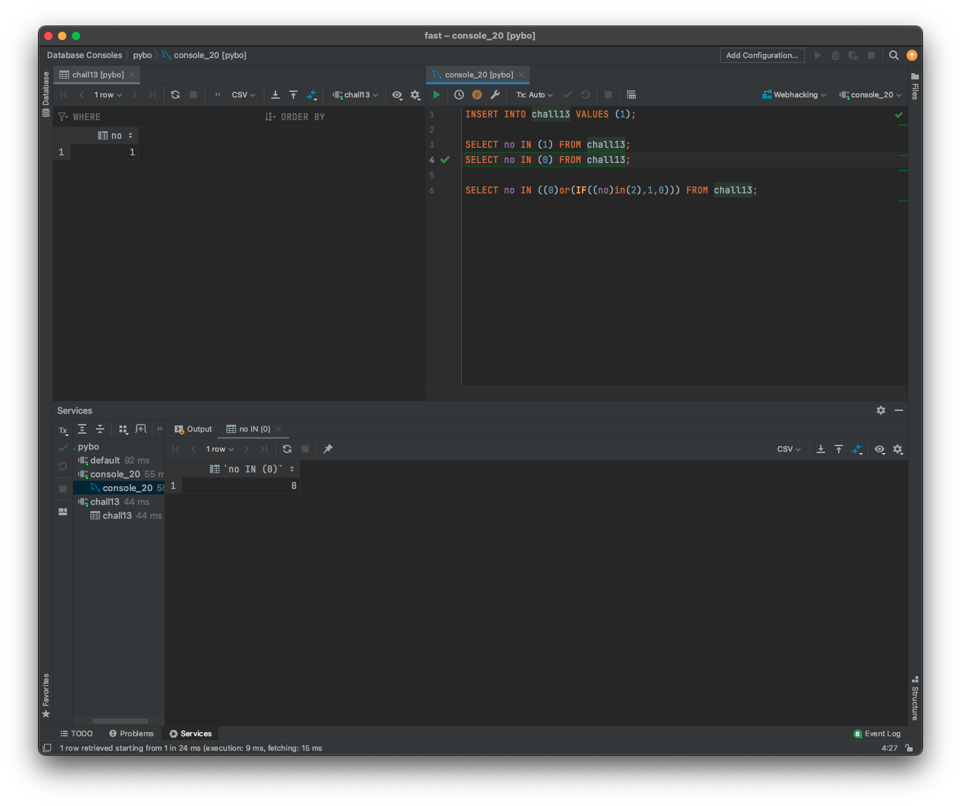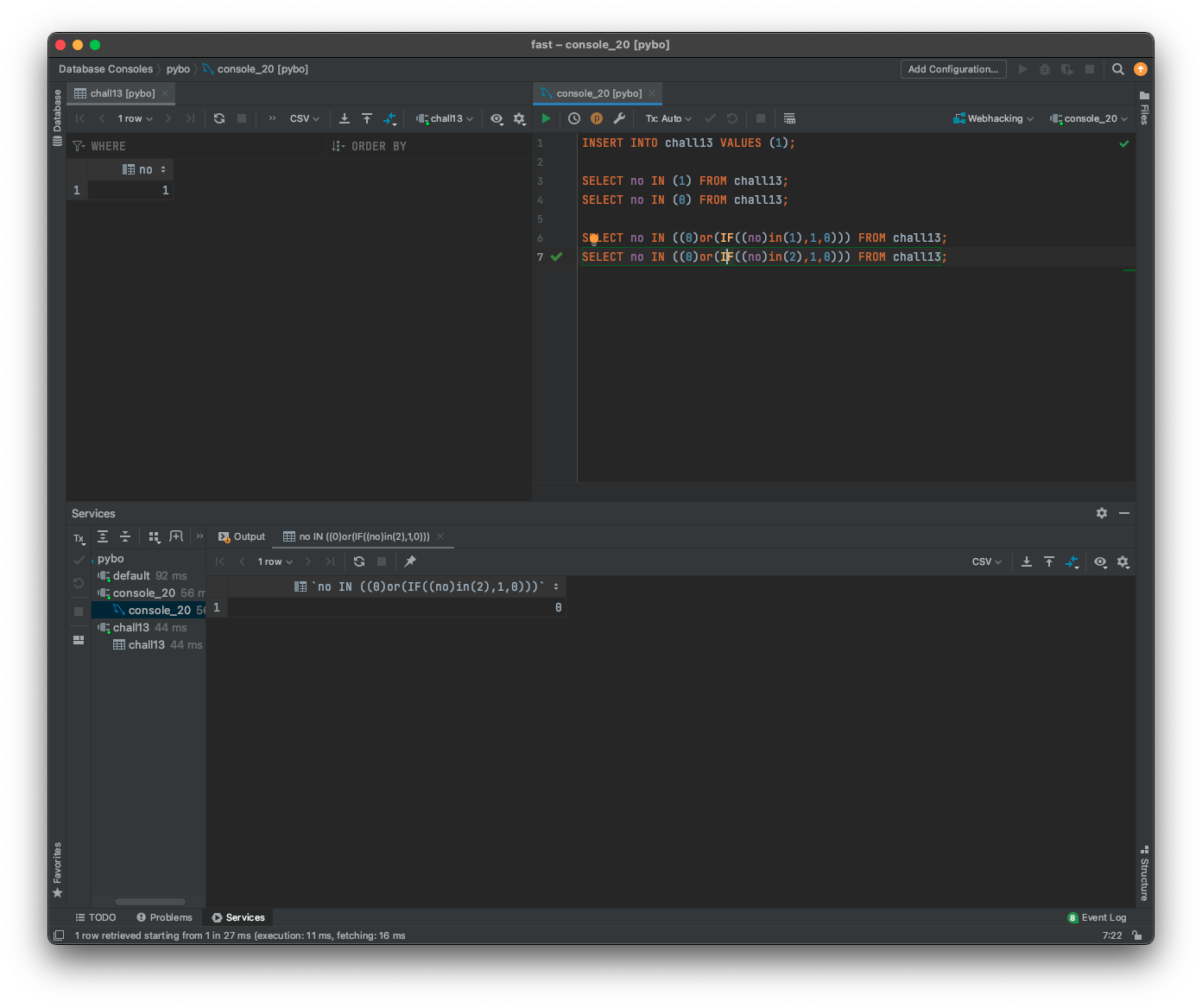 나는 서버에서 사용하는 쿼리문을 추측해봤는데, 아마 SELECT no IN (입력값) FROM chall13으로 추측이 된다.