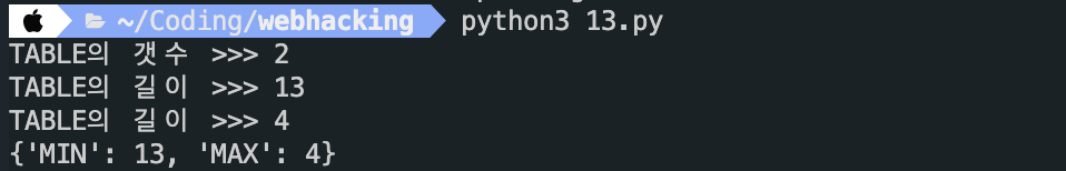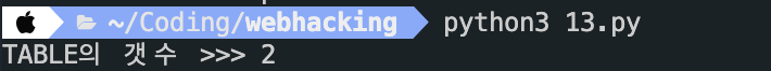 파이썬으로 돌려보면 문제 페이지에서 사용하는 DB의 테이블 갯수가 2개 인 것을 알아낼 수 있었다.