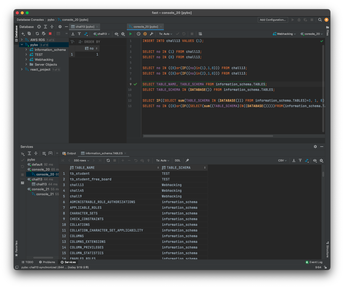 굉장히 많은 시도와 검색 끝에 나는 새로운 사실을 알아낼 수 있었다.SELECT TABLE_SCHEMA IN (DATABASE()) FROM information_schema.TABLES 쿼리문을 사용하면 선택된 DB에 속한 테이블을 알아낼 수 있다.
