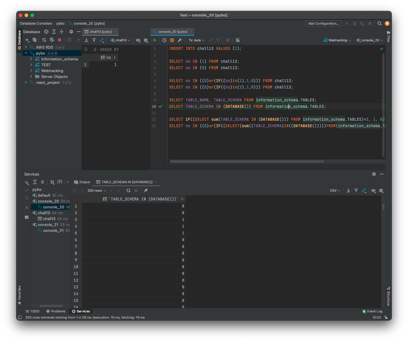 하지만 DATABASE()를 사용하면 현재 사용되는 DB가 출력되고, IN을 통해 사용된 DB에 속한 테이블은 1으로 표시된다.