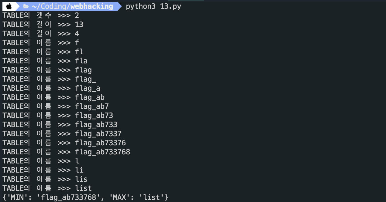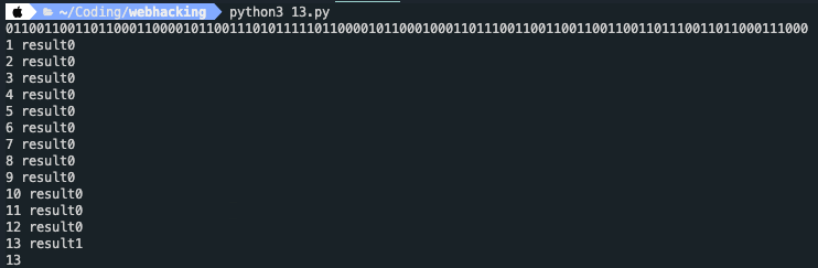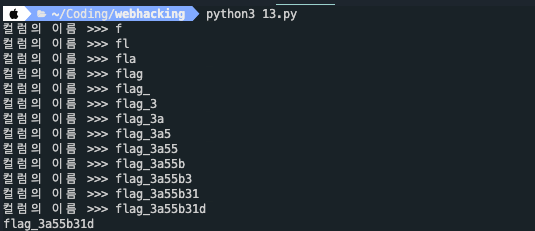 이것을 이용하여 flag_ab733768를 2진수로 사용하여 컬럼의 갯수를 바로 찾을 수 있었다.