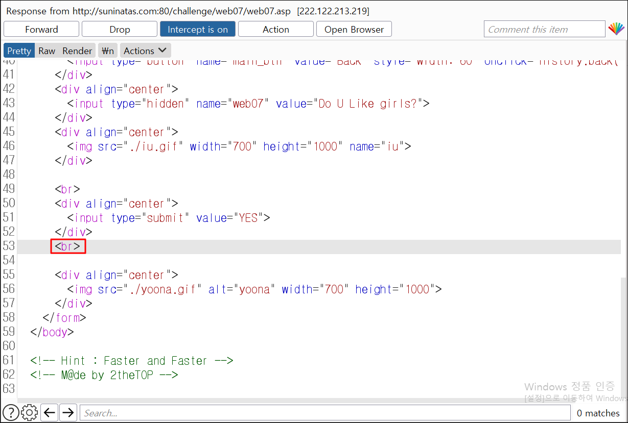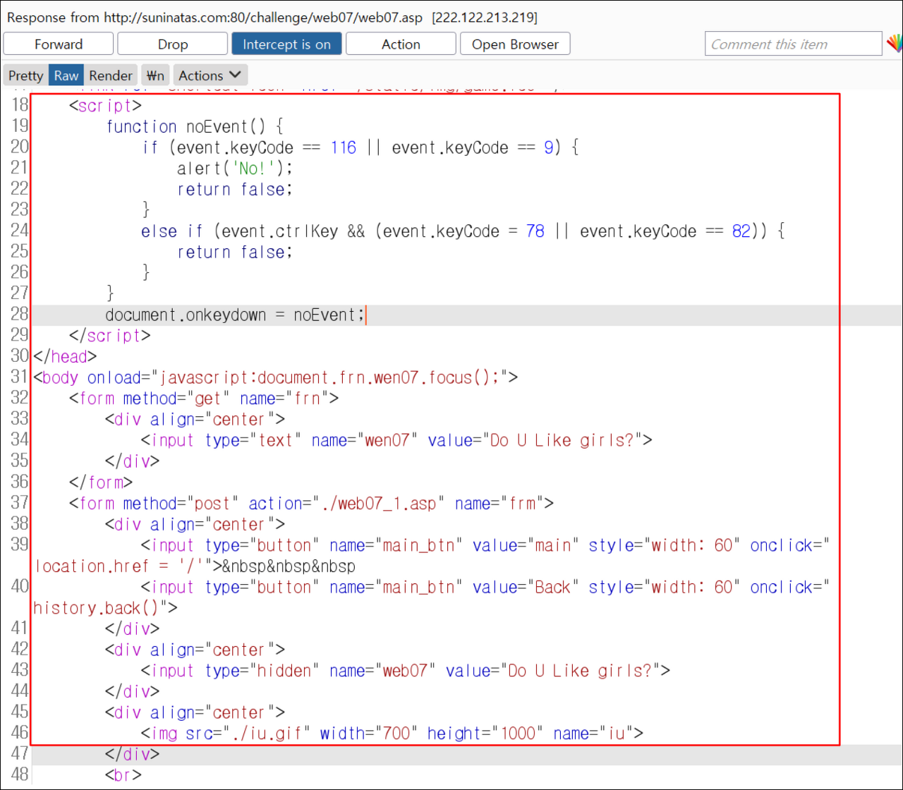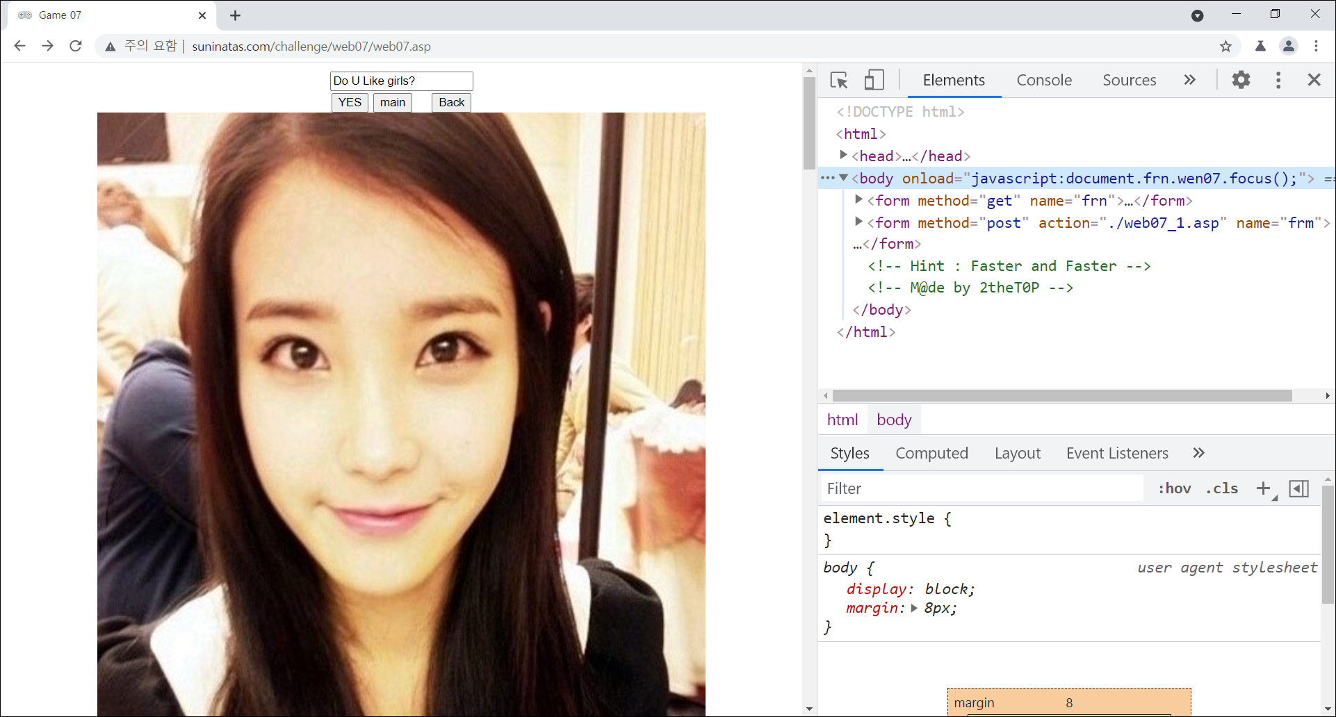 Season 1/워게임 suninatas/웹/7번 문제풀이 작성자 - 한수임 점점 올라갈수록 난이도도 올라가며 풀리는 시간이 오래 걸리는 것 같다... 바로 문제풀이 들어가도록 하겠습니다. 1. 문제 문제 접근 시 볼 수 있는 페이지이다. 스크롤을 내리면 YES 버튼이 생성된다. 2. 문제풀이 YES 버튼을 눌러주면 실패 안내를 통해 느리다는 문구가 뜨게 된다 페이지 접근 시 YES 버튼을 빠르게 눌러야겠다는 생각이 들었으며 그림과 YES 사이에 공백이 많으므로 공백 부분을 없애 YES 버튼을 위로 올린 후 처리하는 방법을 생각해보았다. 요청 패킷을 잡아 공백을 만드는 <br> 태그를 삭제해 주었다. 첫 번째 문제에서 YES 값이 그림 바로 아래 있는 이유는 문제를 한 번에 보여주기 위해 YES 버튼을 이미지 편집을 한 것이다. 버튼을 빠르게 누르기 위해 코드 수정을 통해 버튼을 상위로 올려보았다. 하지만 아무리 빠르게 클릭하여도 실패라는 문구가 뜨게 된다. 클릭하는 속도가 허락하는 속도를 따라가지 못하는 것 같다.. 요청 패킷을 분석해보도록 해야겠다. Function noEvent 함수를 선언하여 event.keyCode 값이 116 or 9 일 경우 NO!라는 구문을 띄우게 된다 그 외에 Ctrl 키 와 이벤트 코드 키 78 or 82 일 경우 실패하게 된다. 이후 form 속성을 보면 post 메소드를 이용하여 폼을 전송할 /web07_1.asp를 지정하여 준다. 여기서 event.keycode 란 JavaScript를 통해 사용자의 키 입력을 감지하여 함수 처리할 수 있다. event.keycode 는 ASCII코드에 기반이 된다. 116 = F5 , 9 = Tab, 78 = n , 82 = r을 나타내게 된다. 페이지에 접근하자마자 YES버튼의 값이 빠르게 페이지에 적용이 되어야 하겠다고 생각하였고, 이를 위해 개발자 모드 콘솔을 통해 페이지에 값을 적용할 수 있도록 해야겠다고 생각을 하였다. Ctrl을 입력 시 입력값이 먹히지 않게 되어있기에 메뉴 > 도구 더보기 > 개발자 도구를 통해 개발자 모드에 접근할 수 있다. 위에 소스에서 분석했던 코드를 토대로 다음 페이지로 넘기기 위한 form의 이름인 frm을 이용하여 YES버튼을 누르면 submit이 되기에 frm.submit()을 입력해보았다. 실패하는 문구가 떴다.... 명령어를 빠르게 다시 전송해 보았다. 서든어택으로 다져진 나의 반응 실력으로 몇 번의 시도 끝에 재빠르게 입력이 가능했다. 저번에 알게된 Auth메뉴를 통해 키값을 입력해 보았다. 여기서 실패하면 어떡하나 걱정이 많이 들었지만 다행히 나를 축하해 주었다. 갈수록 처음 해보는 공격들도 생겨나는 것 같다.... 어렵지만 더욱 열심히 해봐야겠다... *제 개인적인 문제풀이 방식이었으며, 잘못된 점이 있다면 알려주시면 감사하겠습니다. 공유하기 게시글 관리 MSS 'Season 1 > 워게임' 카테고리의 다른 글 [Try - 1~2][Webhacking.kr] BABY (0) 2021.06.25 [dreamhack] Mango 문제풀이 (0) 2021.06.24 [Webhacking.kr] CHILD Write Up (0) 2021.06.23 (HackThisSite) Basic missions - Level 8 (0) 2021.06.21 [dreamhack] simple-ssti 문제풀이 (0) 2021.06.20 Contents 당신이 좋아할만한 콘텐츠 [Try - 1~2][Webhacking.kr] BABY 2021.06.25 [dreamhack] Mango 문제풀이 2021.06.24 [Webhacking.kr] CHILD Write Up 2021.06.23 (HackThisSite) Basic missions - Level 8 2021.06.21 댓글 0 + 이전 댓글 더보기