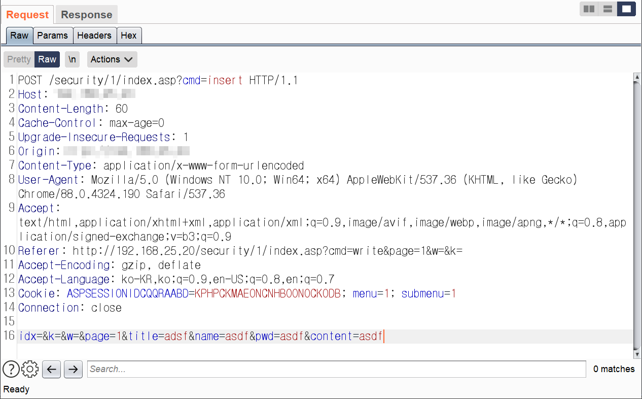 (요청 패킷 모든 입/출력 값 검증이 필요하다. 쿠키 헤더 부분에서도 발생될 수 있음, 또한 대/소문자, 인코딩 등 까지도 고려하여 검증이 이루어져 우회 되지않도록 해야 함)