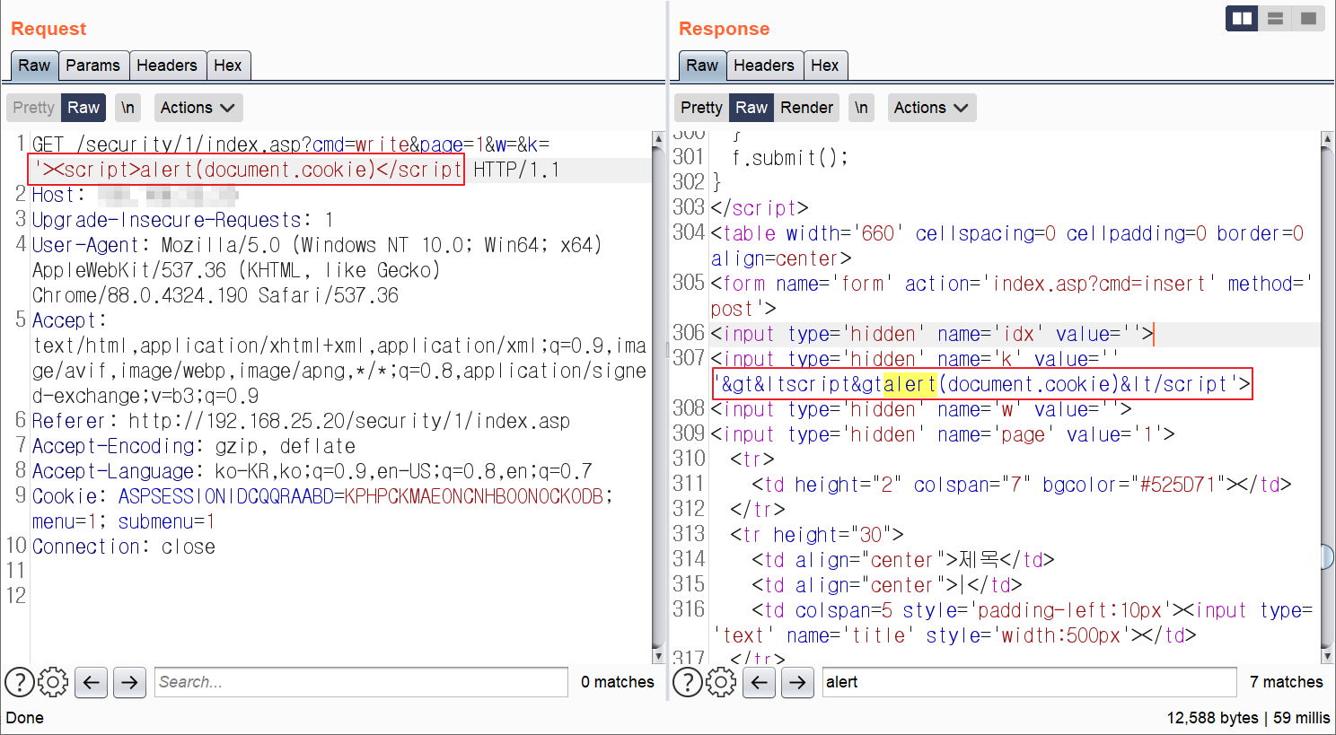 - XSS 공격 벡터가 되기 위해서는 요청 값의 파라미터 값이 응답 값의 파라미터에 포함이 되는지 확인을 해주셔야 합니다.