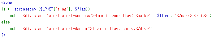 소스를 확인해 보니 POST로 보내준 flag 값과 $flag 값이 일치할 경우 flag 값을 출력해주고 틀리면 "Invalid flag, sorry."라는 문구를 출력해 주는 것을 확인할 수 있다.