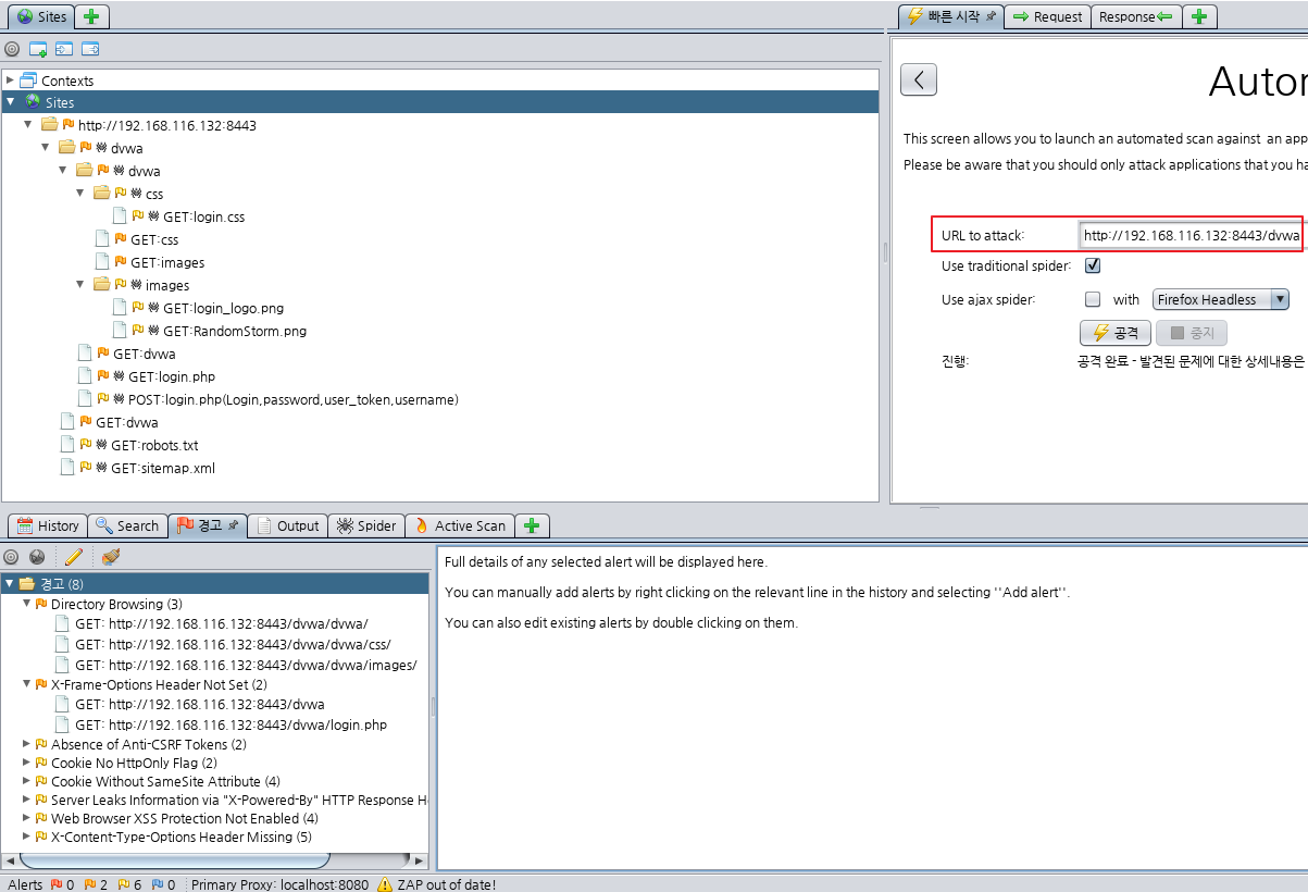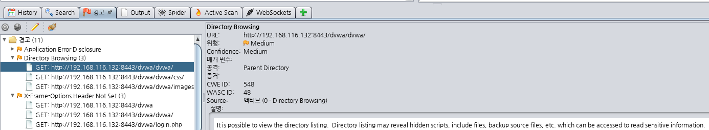 * 경고 : Active Scan이 종료되면 위험도별로 취약점이 나열되는 탭이다. 순서대로 위험도는 상, 중, 하, 정보용이다.