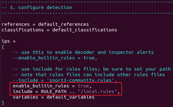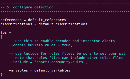 Next, we want to enable decoder and inspector alerts (malicious traic that is detected by Snort, not the rules due to the more complex format), and we want to tell the ips module where our rules file will be (PulledPork will create this for us later) Scroll down to line 169, and look for the section titled ips. Here we un-comment (remove the leading two dashes) from enable_builtin_rules=true, and enable our pulledpork rules. Note that lua uses four spaces, not tabs to indent these lines (this is required). This section should look like this (comments removed):