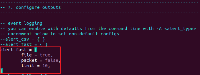 To write Snort 3 events to log files, you need to enable configure alert settings. There are different Snort logging options that are explained well in the Snort 3 manual, Logger Modules section. To output the event data to a file, in brief format (as defined in the command line above by option -A alert_type), open the snort.lua configuration and head over to the outputs section.