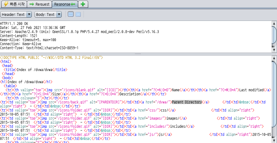 * 탐지된 경고(취약점 항목)을 클릭하면 우측에 탐지 세부내용 확인가능하며, Request와 Response 탭을 눌러 그 내용을 확인하면 취약점 점검 방법을 보다 자세히 알 수 있음
