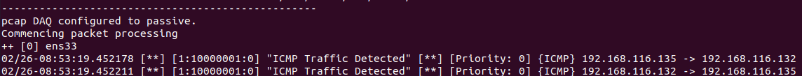 alert icmp any any -> any any ( msg:"ICMP Traffic Detected"; sid:10000001; metadata:policy security-ips alert; )