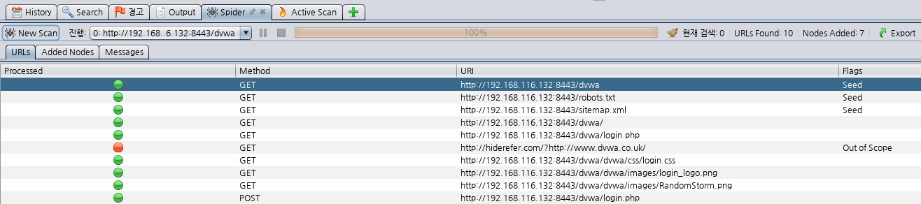 * Spider : 공격시에 웹 로봇 기능을 수행하여 웹페이지에서 발견되는 모든 URL을 수집하는 기능이다. 사이트의 크기에 따라 소요 시간이 수 분에서 수 시간이 소요된다.