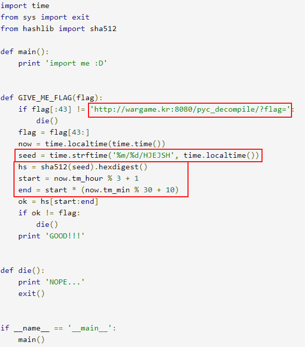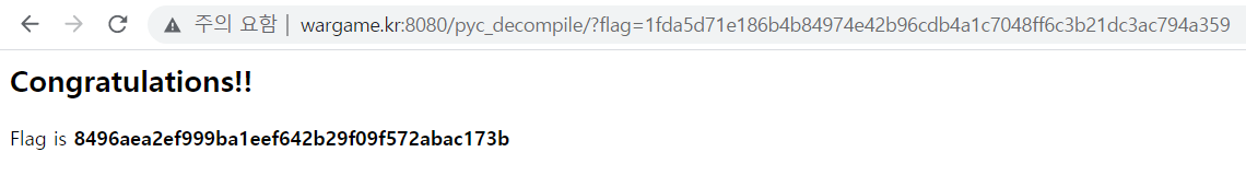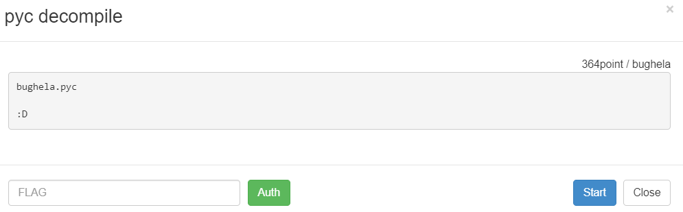 Season 1/워게임 Wargame - pyc decompile 작성자 - 알 수 없는 사용자 문제 - 디컴파일 문제 - Start Start - 파이썬~, python~, 현재 시각, bughela.pyc 파일 - 외 특이사항은 보이지 않음 - bughela.pyc 파일 - .pyc파일에 대해 알아본 결과 간단히 파이썬 임시파일이라고 보면 될 것 같다. - 파이썬 언어로 작성된 코드를 컴파일하게 되면 실행파일이 생성되고 프로그램이 실행되는데, 이러한 컴파일 과정을 효율적으로 하기위해 임시파일을 생성하여 반복적인 작업을 줄인다고 한다. - 따라서 .pyc파일을 디컴파일 하면 파이썬 코드를 확인할 수 있다. - bughela.pyc (디컴파일) 디컴파일 된 bughela.pyc 파일 - 온라인 디컴파일러를 사용한 결과 위와 같은 코드 확인. - flag 는 http://wargame.kr:8080/pyc_decompile/?flag=FLAG - 여기서 변수 flag의 값인 FLAG를 확인 한다. - 빨간 네모를 보면 현재 날짜를 출력하여 오늘 기준으로 '07/05/HJEJSH' 문자열을 sha512 해쉬한다. - 1. 현재 시간을 이용는데, 현재 시를 3으로 나머지 연산하고 더하기 1한 값을 위의 해시 값 인덱스 번호로 활용 - 2. 현재 분을 30으로 나머지 연산 후 더하기 10 을 한 값을 1번 값과 곱한 값을 인덱스 번호로 활용 - 결과적으로 해시 값 문자열에서 1번 인덱스의 문자부터 2번 인덱스 문자까지가 플래그가 된다. - 처음 Start페이지에 있는 시간을 기준으로 14:40분이라면 - 1. 14 % 3 + 1 = 3 - 2. (40 % 30 +10) * 3 = 60 따라서 '07/05/HJEJSH' 의 해시값의 3번째 인덱스부터 60번째 인덱스까지가 플래그이다. 플래그 - 1f ~ 359 까지가 플래그 문제 해결 공유하기 게시글 관리 MSS 'Season 1 > 워게임' 카테고리의 다른 글 [Lord of SQLInjection] Goblin Write UP (0) 2021.07.06 [dreamhack] funjs 문제풀이 (0) 2021.07.06 Wargame - fly me to the moon (0) 2021.07.05 [Lord of SQLInjection] Coblt Write UP (0) 2021.07.05 [Lord of SQLInjection] Gremlin Write UP (0) 2021.07.05 Contents 당신이 좋아할만한 콘텐츠 [Lord of SQLInjection] Goblin Write UP 2021.07.06 [dreamhack] funjs 문제풀이 2021.07.06 Wargame - fly me to the moon 2021.07.05 [Lord of SQLInjection] Coblt Write UP 2021.07.05 댓글 0 + 이전 댓글 더보기