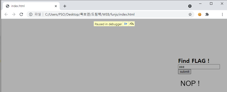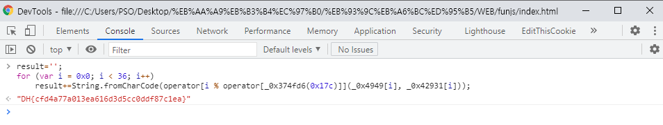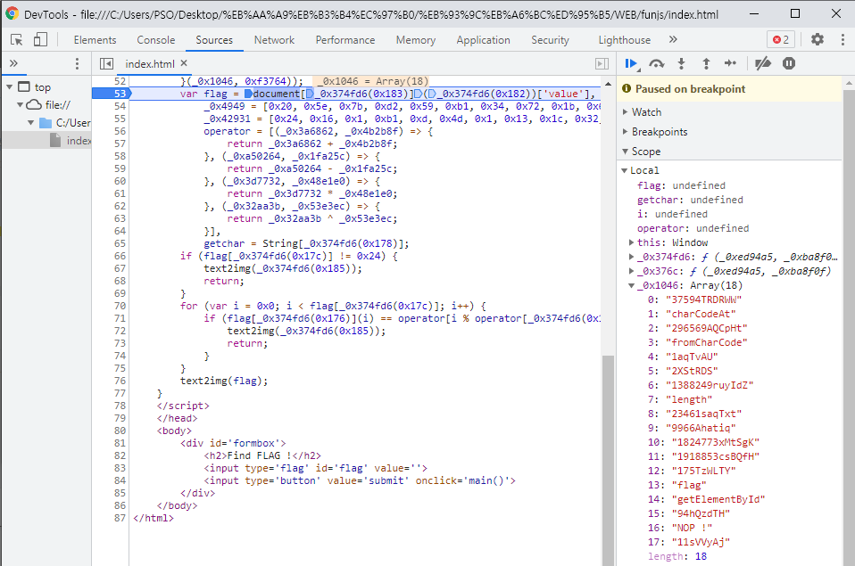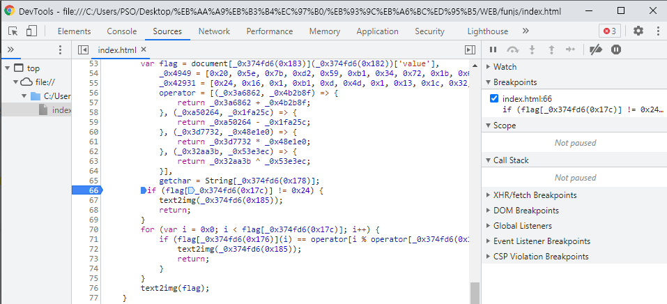 사실 위에서 난독화된 함수를 따라갈 필요 없이 개발자모드의 breakpoint를 이용해 손쉽게 풀 수 있는 문제다.