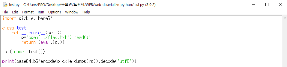 'name' 값에 test() 를 입력한 후 pickle 한다.