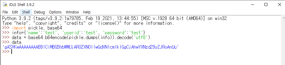 먼저 세션을 생성할 때, base64.b64encode(pickle.dumps(info)).decode('utf8') 구문으로 생성이 된다.