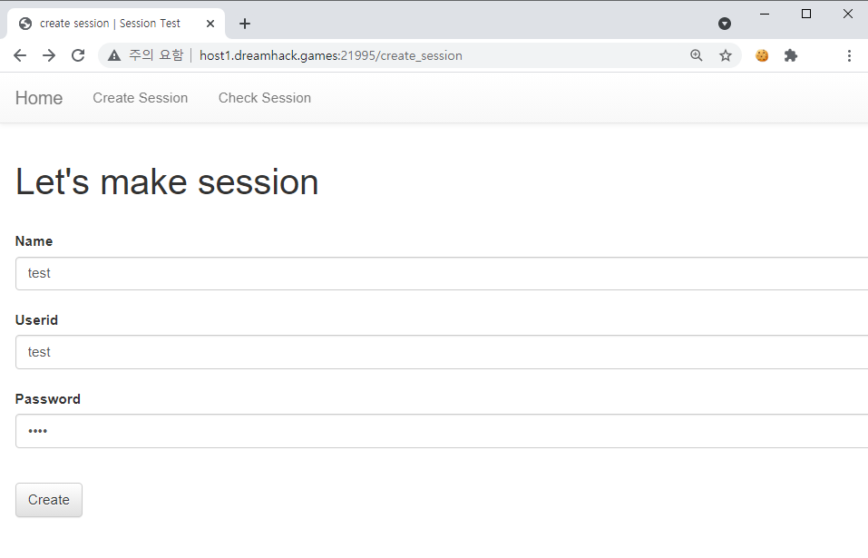 Name=test, Userid=test, Password=test 를 입력하여 세션을 생성했다.
