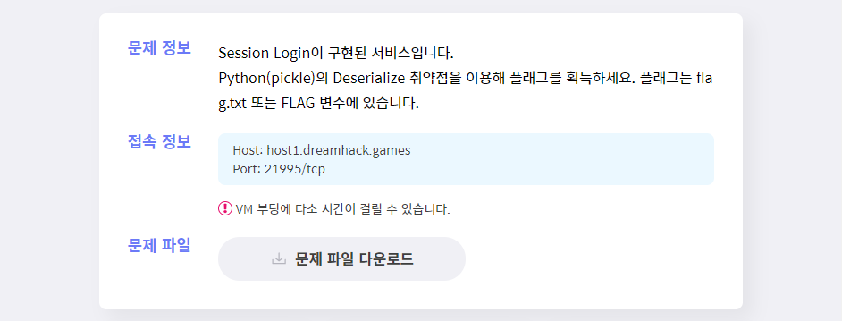 Session Login 서비스에서 Python(pickle)의 역직렬화 취약점을 이용해 플래그를 획득하는 문제이다.