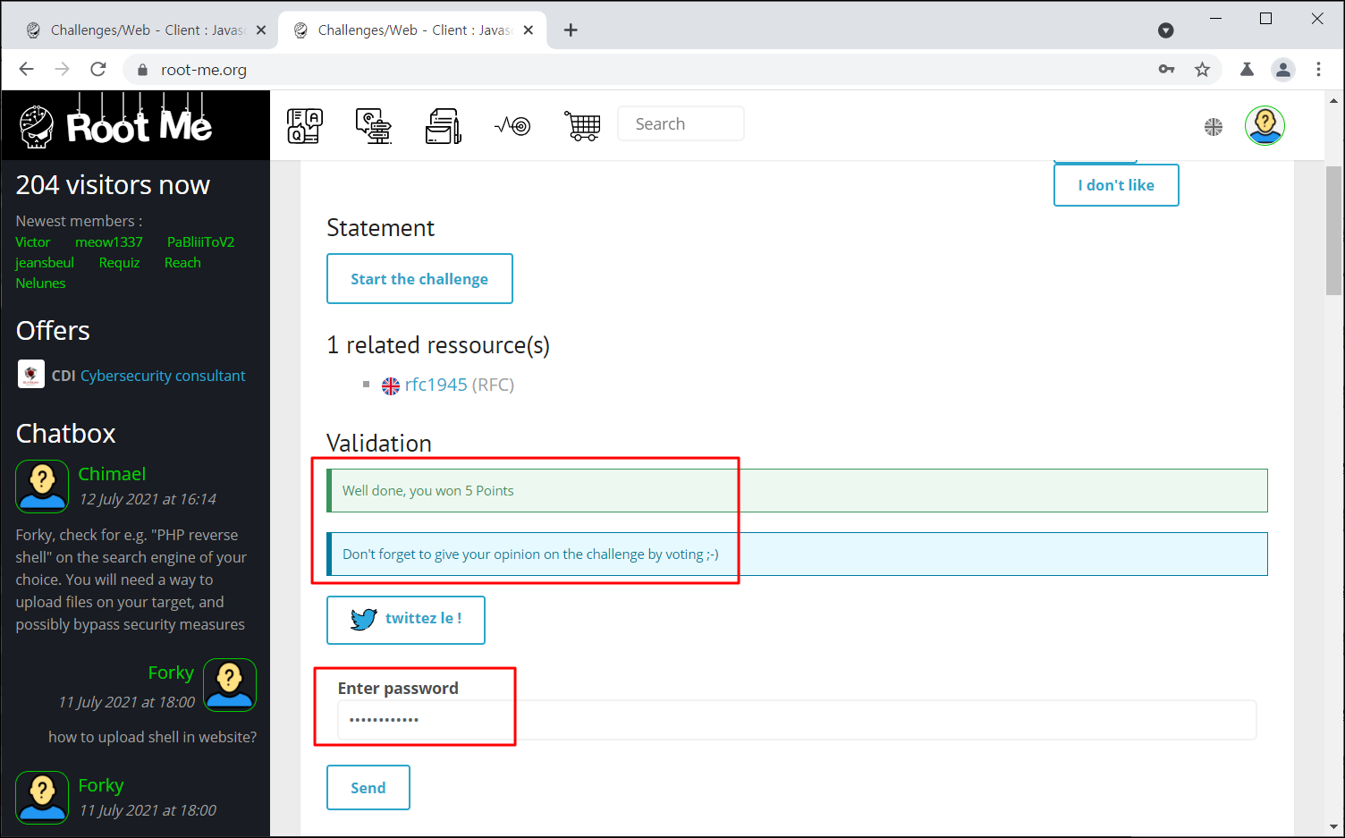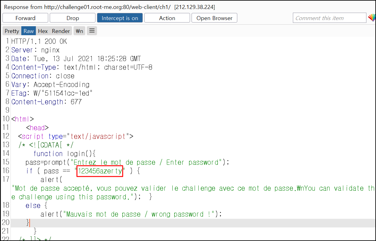 Season 1/워게임 [Root-Me]/Web-Client/Javascript - Source 작성자 - 한수임 세 번째 문제 시작하도록 하겠습니다~ 1. 문제 문제에 접근하게 되면 패스워드를 입력하라는 창이 뜨게 된다. 2. 문제풀이 뜬금없이 패스워드를 입력하라고 한다.... 우선 어떠한 반응이 일어나는지 확인하기 위해 test문구를 입력하여 보았다. 이후 반응을 보니 잘못된 패스워드라는 값을 던져주었다. 어떻게 생겨먹은 로직인지 확인하기 위해 패킷을 잡아보았다. 패킷을 잡으니 pass 값이 나와있다. 이를 다시 패스워드 입력 칸에 입력해보았다. 결과는... 이 패스워드 값을 검증하는 곳에 사용하라는 것 같다. 검증하는 곳에 의뢰를 맡기니 파랑새가 반겨주었다~ 이전에 패킷을 잡으면 안 잡히는 현상이 있었다. 이를 확인해 보니 두 번째 패킷을 잡을 때부터는 304를 뿌려주었다. 이게 무엇인지 조사해보니 304 Not Modified를 통해 요청된 리소스를 재전송할 필요가 없음을 나타낸다고 한다. 요청 조건부로 If-None-Match, If-Modified-Since 헤더를 사용할 때 응답이 된다고 한다. 그래서 확인해보니 요청 값에 If-None-Match, If-Modified-Since 헤더가 들어있는 것을 확인할 수 있었다. 이 부분을 삭제 처리하니 패킷을 정상적으로 보여주는 것을 확인할 수 있었다. 하나씩 배워가는 맛이 정말 맛있는 것 같다. 오늘 문제풀이 끄읏~ 공유하기 게시글 관리 MSS 'Season 1 > 워게임' 카테고리의 다른 글 [Lord of SQLInjection] Darkelf Write UP (0) 2021.07.14 [Lord of SQLInjection] Wolfman Write UP (0) 2021.07.14 [Lord of SQLInjection] Orc Write UP (0) 2021.07.12 [Root-Me]/Web-Client/Javascript - Authentification (0) 2021.07.12 [Root-Me]/Web-Client/HTML - boutons désactivés(disabled button) (0) 2021.07.12 Contents 당신이 좋아할만한 콘텐츠 [Lord of SQLInjection] Darkelf Write UP 2021.07.14 [Lord of SQLInjection] Wolfman Write UP 2021.07.14 [Lord of SQLInjection] Orc Write UP 2021.07.12 [Root-Me]/Web-Client/Javascript - Authentification 2021.07.12 댓글 0 + 이전 댓글 더보기