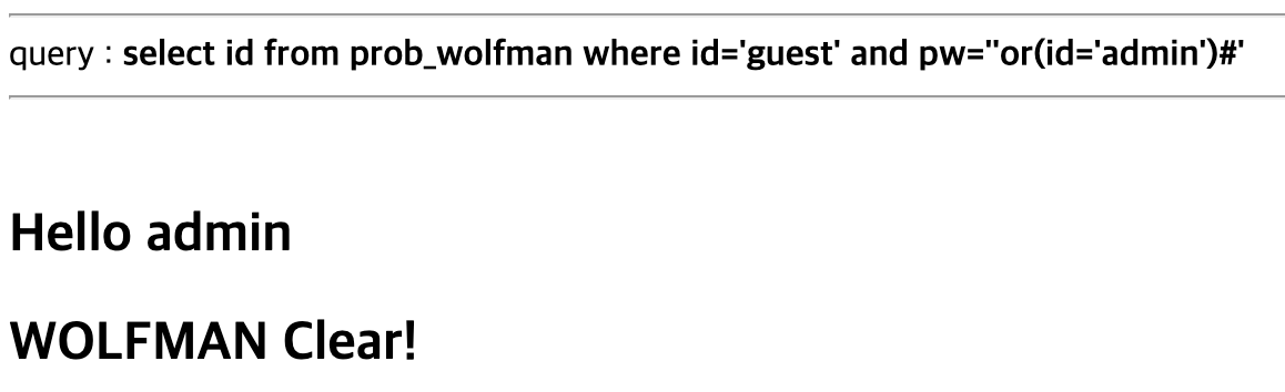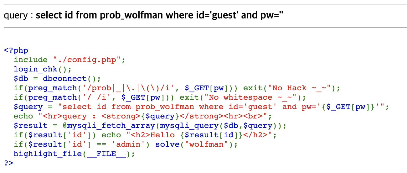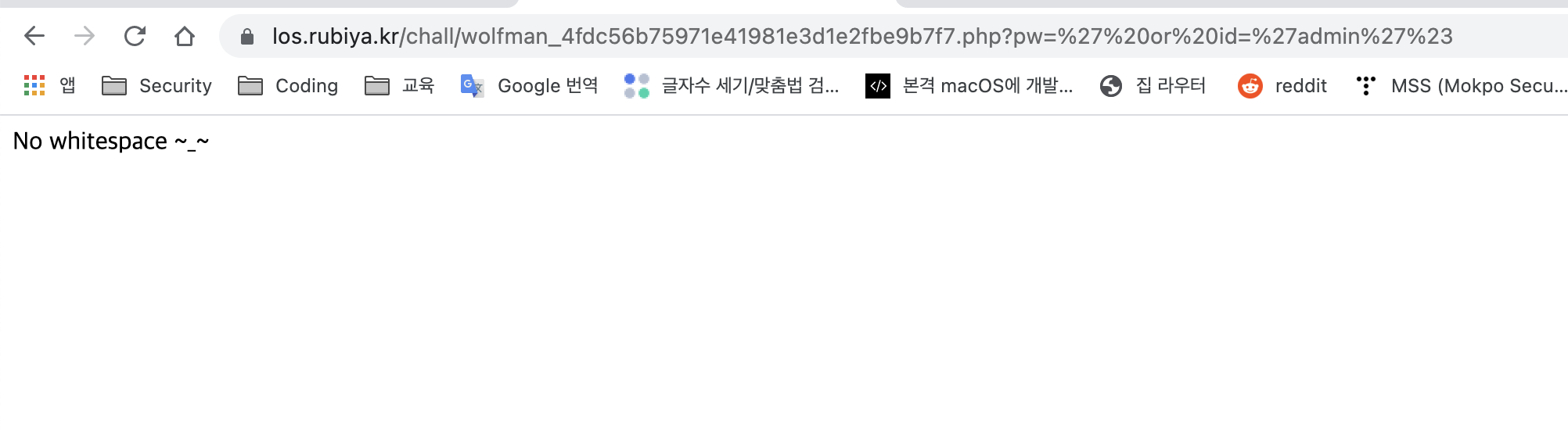 Season 1/워게임 [Lord of SQLInjection] Wolfman Write UP 작성자 - LRTK pw를 입력을 받는데, 쿼리문의 결과 id는 admin이어야 문제를 풀 수 있다.필터링되는 문자은 prob, _, ., (, ), 공백이다. 일단 or 연산을 이용하여 id='guest' and pw='' or id='admin' -> False or True으로 만들어줘서 True인 id='admin'이 작동하도록 하겠다. 하지만 or id='admin'에는 공백이 있어서 if(preg_match('/ /i', $_GET[pw])) exit("No whitespace ~_~");이 작동되었다. 그래서 or 뒤에 공백 대신 ()를 감싸줘서 공백을 없애주도록 하겠다. or 뒤 (,)은 No Hack ~_~ 조건문에 걸리지 않는 듯 하다. 공유하기 게시글 관리 MSS 'Season 1 > 워게임' 카테고리의 다른 글 [websec.fr] easy - Level 08 (0) 2021.07.14 [Lord of SQLInjection] Darkelf Write UP (0) 2021.07.14 [Root-Me]/Web-Client/Javascript - Source (0) 2021.07.14 [Lord of SQLInjection] Orc Write UP (0) 2021.07.12 [Root-Me]/Web-Client/Javascript - Authentification (0) 2021.07.12 Contents 당신이 좋아할만한 콘텐츠 [websec.fr] easy - Level 08 2021.07.14 [Lord of SQLInjection] Darkelf Write UP 2021.07.14 [Root-Me]/Web-Client/Javascript - Source 2021.07.14 [Lord of SQLInjection] Orc Write UP 2021.07.12 댓글 0 + 이전 댓글 더보기