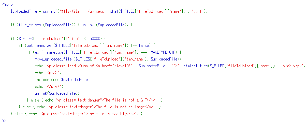 Season 1/워게임 [websec.fr] easy - Level 08 작성자 - 호롤로롤 level 8 같은 경우는 GIF 파일만 올릴 수 있으며 우회를 하여 flag값을 얻는 문제인거 같다. 소스보기를 통해 살펴보니 업로드 파일 크기, 파일 확장자 체크를 하는듯 보인다. 이를 통해서 flag 값을 얻을려면 아마 웹쉘같은 파일을 업로드 시켜보면 flag 값에 대한 힌트를 받을 수 있지 않을까 라는 생각으로 접근을 하였다. 그러나, 웹쉘 파일을 통해서 시스템 명령어를 넣어서 업로드 시켜보았지만 먹히지 않았다.. 그러던 중 소스코드에서 php를 사용하는 것을 보고 php 명령어를 찾아보는 중에 scandir함수를 발견했다. scandir() 함수는 지정된 디렉토리의 파일 및 디렉토리의 배열을 반환하는 함수이다. 이를 바탕으로 문제를 풀어보자! 문제를 푸는데 사용하는 명령어는 아래와 같다. <?php print_r(scandir('./')); ?> 짜란! 2번에 보면 flag.txt파일이 있는 것을 확인 할 수 있었다. 그럼 아까 소스에 덧붙혀서 flag 파일 안의 내용을 확인해보자. flag 값은 WEBSEC{BypassingImageChecksToRCE}으로 확인할 수 있었다. +++ 추가로 PHP 5버전 미만은 readdir 함수를 통해서 확인해 볼 수 있다고 한다! 참고 http://www.w3big.com/ko/php/func-directory-scandir.html PHP를 위해 scandir () 함수 PHP를 위해 scandir () 함수 PHP 디렉토리 참조 예 이미지는 파일 및 디렉토리의 디렉토리에 나열되어 있습니다 : www.w3big.com 공유하기 게시글 관리 MSS 'Season 1 > 워게임' 카테고리의 다른 글 [Lord of SQLInjection]Troll Write UP (0) 2021.07.16 [Lord of SQLInjection] Orge Write UP (0) 2021.07.16 [Lord of SQLInjection] Darkelf Write UP (0) 2021.07.14 [Lord of SQLInjection] Wolfman Write UP (0) 2021.07.14 [Root-Me]/Web-Client/Javascript - Source (0) 2021.07.14 Contents 당신이 좋아할만한 콘텐츠 [Lord of SQLInjection]Troll Write UP 2021.07.16 [Lord of SQLInjection] Orge Write UP 2021.07.16 [Lord of SQLInjection] Darkelf Write UP 2021.07.14 [Lord of SQLInjection] Wolfman Write UP 2021.07.14 댓글 0 + 이전 댓글 더보기