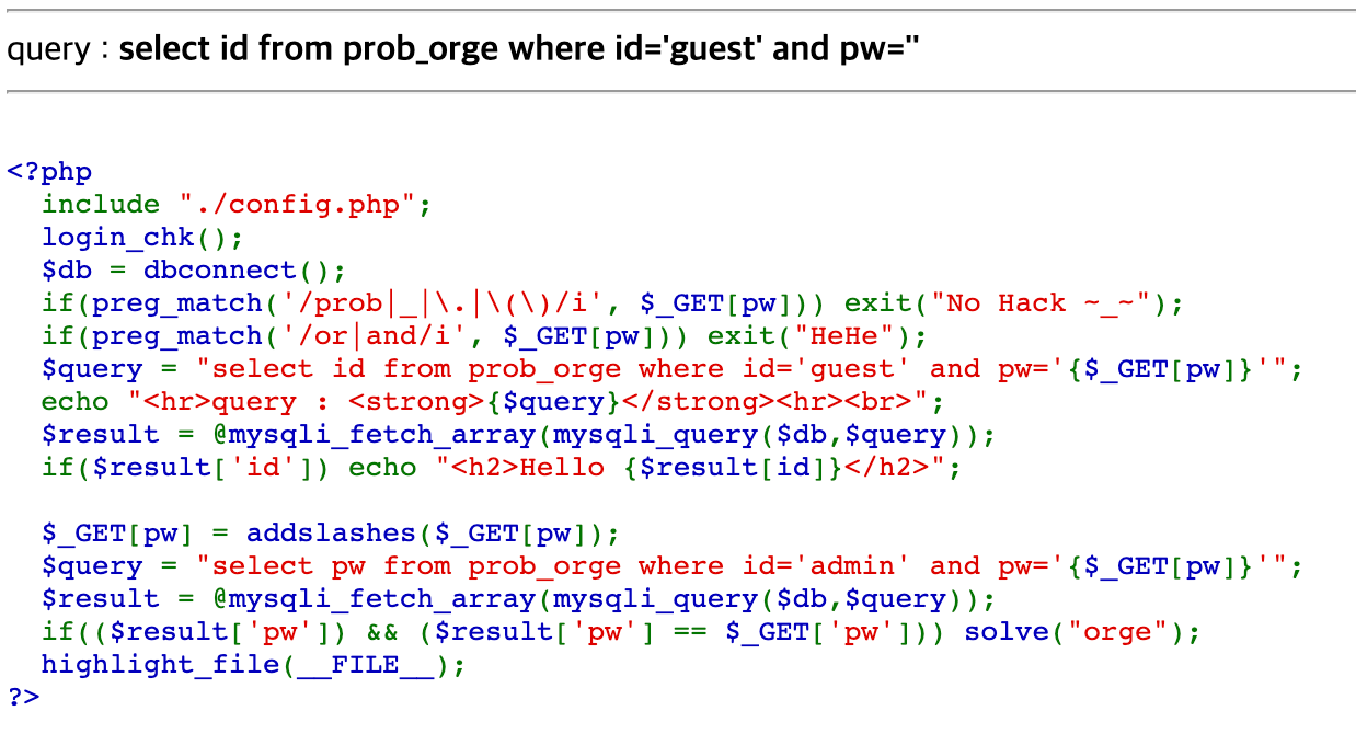 or, and가 필터링되어 있기 때문에 ||, &&를 이용하면 되고, addslashes 함수를 통해 ', ", \, Null 바이트를 사용하지 못하게 치환하기 때문에 문자열은 Hex 값으로 넘겨주면 우회가 된다.