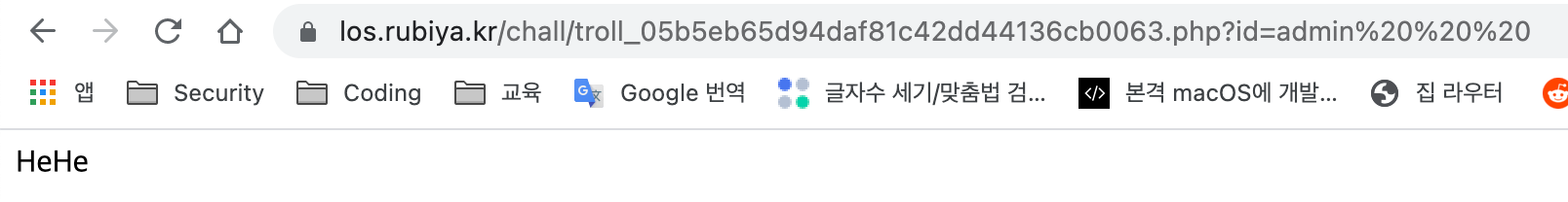 하지만 admin 필터링을 우회를 못하기 때문에 hehe가 출력되었다.