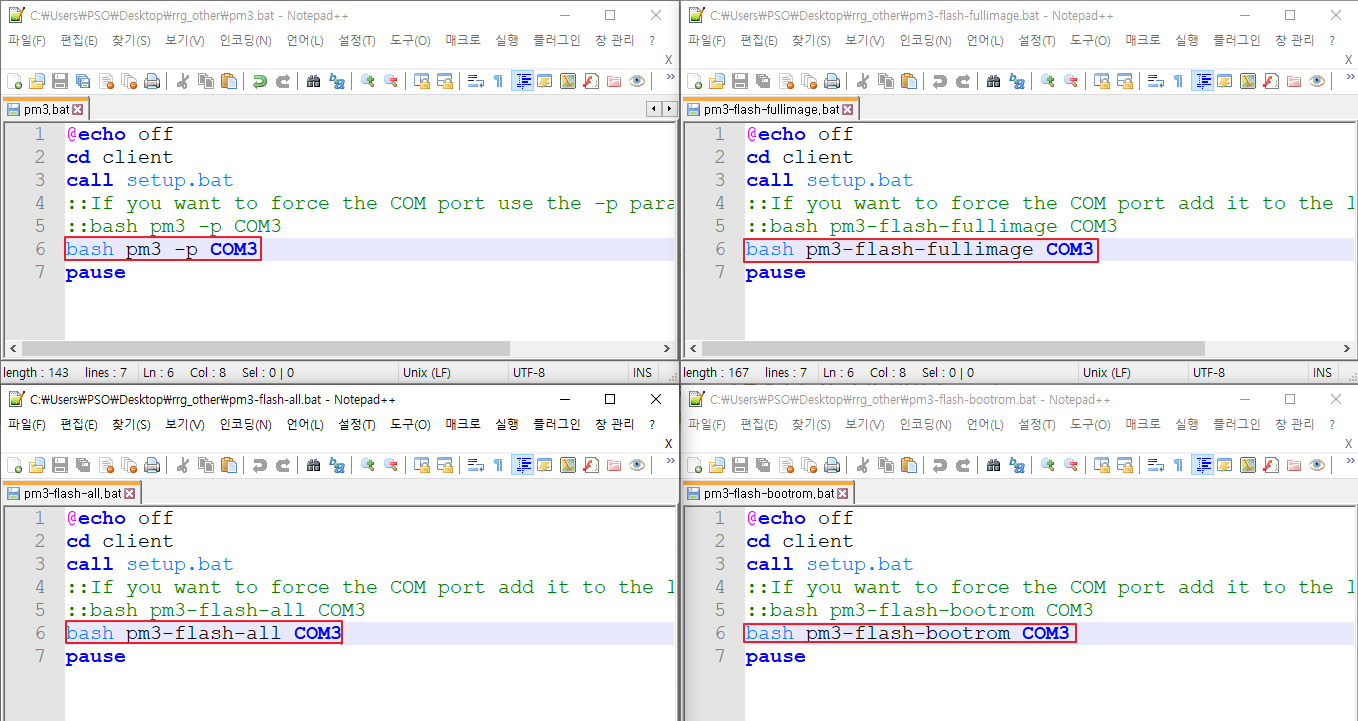 ② 다운받은 rrg_other 폴더 내 배치파일을 모두 편집하여 장치명 인자를 내 장치(COM3)로 변경한다.
