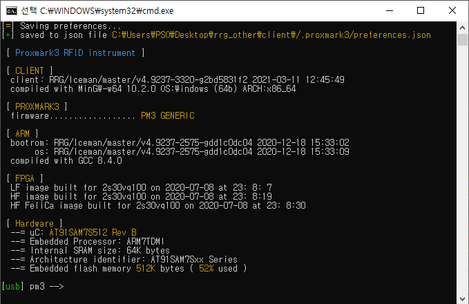 3번이 정상적으로 수행되었다면 pc에 연결된 proxmark3가 실행된다.