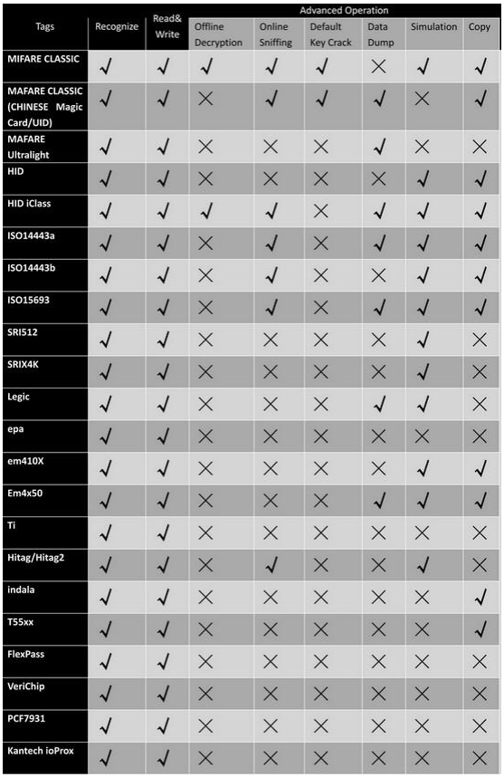 Proxmark3 easy가 공식적으로 지원하는 기능은 아래와 같으며, 대중적으로 사용되는 RFID 규격 대부분을 지원하기 때문에 활용도가 높다. 특히 국내/외에서 가장 많이 사용되는 Mifare CLASSIC과 T55XX 모델을 지원한다.