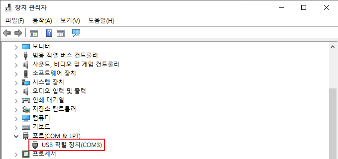 ① 내 PC > 속성 > 장치관리자 > 포트 에서 현재 연결된 장치(COM3)를 확인한다.
