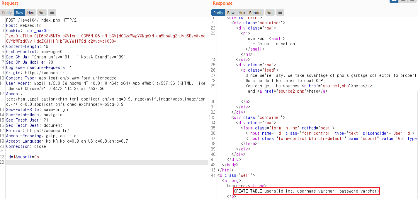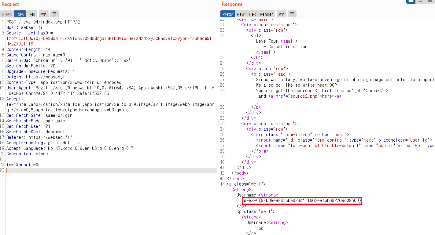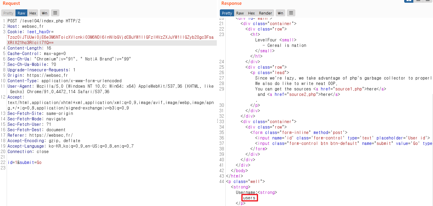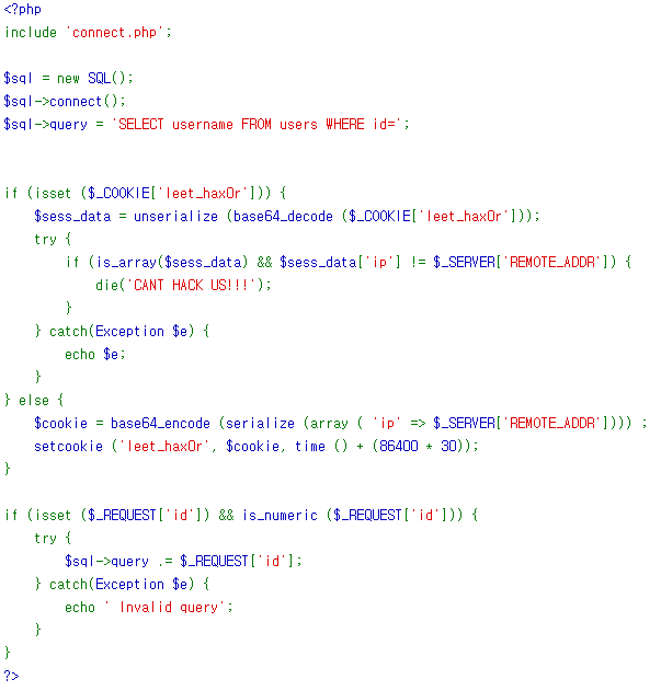 Season 1/워게임 [websec.fr] babysteps - Level 04 작성자 - 호롤로롤 level 4번 시작! 바로 소스보기를 통해 확인.. 첫번째 소스코드를 처음부터 살펴보자. 2가지 내용을 확인할 수 있었다. 1.SQL이란 객체를 생성하고 connect 함수를 실행시키고 query에 쿼리문이 담겨있다. 2.leet_hax0r 쿠키값을 base63로 디코딩을 한 후 unserialize를 하는 것을 확인 할 수 있다. 두번째 소스코드를 보면 첫번째 소스코드에서 알 수 있었던 connect 함수를 여기서 호출하는것을 확인할 수 있다. 그리고 마지막 __destruct() 함수를 볼 필요가 있다. __destruct() 함수는 소멸자로서 특정 객체를 참조 후 또는 객체가 명시적으로 파기된 후 메소드를 호출한다.정리하면 SQL 객체가 실행되고 파기된 후 destruct()함수가 호출되면 username의 결과 값이 나오게 된다.이제 문제를 풀어보자! 1. 테이블 이름 찾기 O:3:"SQL":1:{s:5:"query";s:42:"select name as username from sqlite_master";} 2. 컬럼명 찾기 O:3:"SQL":1:{s:5:"query";s:64:"select sql as username from sqlite_master where tbl_name='users'";} 3.flag 값 O:3:"SQL":1:{s:5:"query";s:38:"select password as username from users";} 이렇게 flag값은 WEBSEC{9abd8e8247cbe62641ff662e8fbb662769c08500} 으로 찾을 수 있었다! 참조 PHP Object Injection https://m.blog.naver.com/PostView.naver?isHttpsRedirect=true&blogId=padocon&logNo=220631783636 PHP Object Injection 예전에 POI 관련 자료들 찾아보다가 국내에는 자세히 설명된 문서가 하나도 없는것 같아서 외국문서를 ... blog.naver.com https://blog.sonarsource.com/php-object-injection?redirect=rips PHP Object Injection A very common and critical vulnerability in PHP applications is PHP Object Injection. This blog post explains how they work and how they can lead to a full site takeover by remote attackers. blog.sonarsource.com 공유하기 게시글 관리 MSS 'Season 1 > 워게임' 카테고리의 다른 글 [Lord of SQLInjection] Bugbear Write UP (0) 2021.07.20 [Lord of SQLInjection] Darkknight Write UP (0) 2021.07.19 [Lord of SQLInjection] Golem Write UP (0) 2021.07.18 [Lord of SQLInjection] Skeleton Write UP (0) 2021.07.18 [Lord of SQLInjection] Vampire Write UP (0) 2021.07.18 Contents 당신이 좋아할만한 콘텐츠 [Lord of SQLInjection] Bugbear Write UP 2021.07.20 [Lord of SQLInjection] Darkknight Write UP 2021.07.19 [Lord of SQLInjection] Golem Write UP 2021.07.18 [Lord of SQLInjection] Skeleton Write UP 2021.07.18 댓글 0 + 이전 댓글 더보기