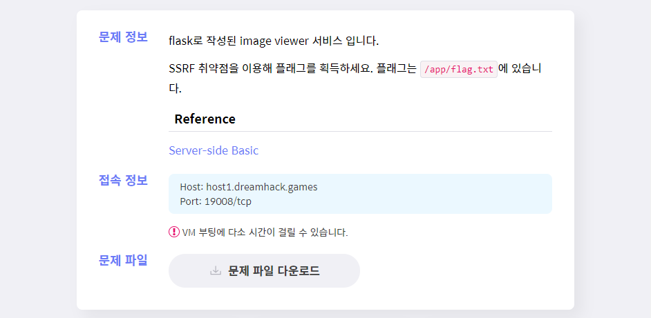 Flask로 작성된 Image Viewer 서비스에서 SSRF 취약점을 이용해 /app/flag.txt에 위치한 플래그를 획득하는 문제이다.