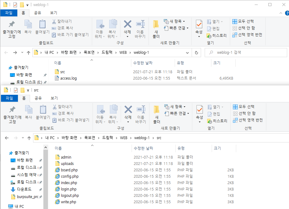 웹 서버의 Access log와 php로 작성된 소스코드 파일을 확인할 수 있다.