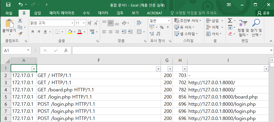 공백으로 구분하고 로그 분석에 불필요해 보이는 셀들은 숨겨주자.