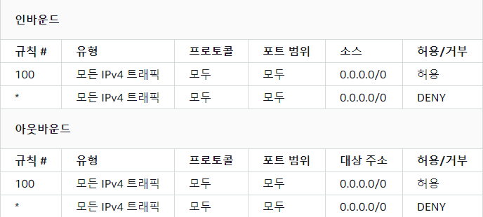 보안 그룹의 경우 허용된 인바운드 트래픽에 대한 응답은 아웃바운드 규칙과 관계없이 아웃바운드로 흐르는 것이 허용됩니다. 반대로 아웃바운드로 나간 트래픽에 대한 응답은 인바운드 규칙과 관계없이 인바운드로 흐르는 것이 허용됩니다. ex) 80포트로 들어오는 트래픽을 허용하면 송신 포트 80이 자동으로 열립니다.