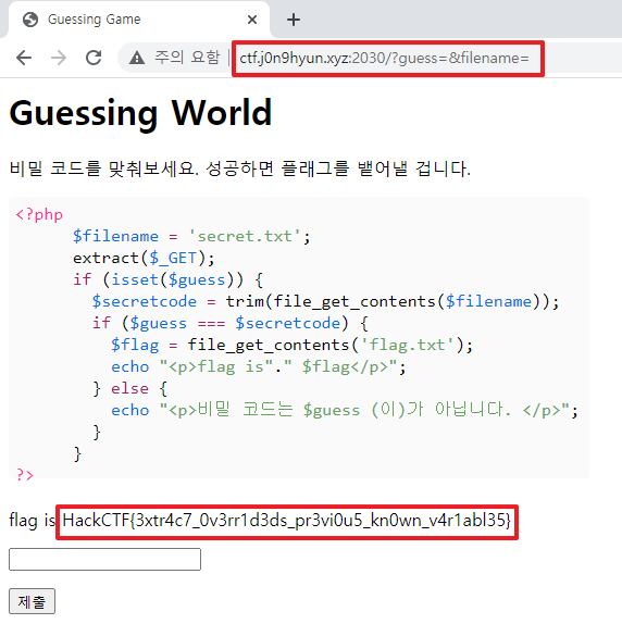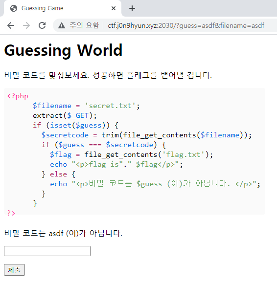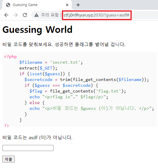Season 1/워게임 [HackCTF] Web - Guess me 풀이 작성자 - 호롤로롤 들어가니 php 코드와 함께 문제가 주어졌다. 코드를 살펴보니 secret.txt 파일 안에 $secretcode 값과 입력하는 $guess 값이 일치해야 flag 값이 나오는 듯 하다. 임의로 'asdf'라는 값을 넣어보니 GET 방식으로 guess라는 파라미터 값에 'asdf' 값이 들어 있는것을 볼 수 있었다. 이때 소스코드를 보면 guess라는 파라미터에 값을 넣어 보냈으니 &구분자와 filename에 같은 값을 넣어 보내면 flag 값이 나오지 않을까 생각해보았다. 흠, 이렇게 푸는 문제가 아닌가보다. 그래서 코드를 다시한번 살펴보니 extract함수를 볼수 있었다. extract함수는 전에 변수가 선언되어 있을 때, 변수를 한번 더 선언해 주면 초기 값으로 변경이 된다. 즉, url 뒤에 guess=&filename= 을 입력하게되면 filename 함수가 null로 초기화 되면서 guess 값과 secretcode 값이 동일한 값으로 인지하여 flag 값을 얻을 수 있는 것이다. 이렇게 flag 값은 HackCTF{3xtr4c7_0v3rr1d3ds_pr3vi0u5_kn0wn_v4r1abl35} 이라는 것을 알 수 있었다. 참조 https://j-ungry.tistory.com/10 extract() 함수 extract() 함수는 배열속의 키값을 변수로 만들어주는 역할을 한다 예를들어 $_GET[a]="Hello"; $_GET[b]="World"; extract($_GET); echo $a; echo $b; 라고하면 Hello World 가 출력되는 거다 취약점이 있다고 하.. j-ungry.tistory.com 공유하기 게시글 관리 MSS 'Season 1 > 워게임' 카테고리의 다른 글 [HackCTF] Web - Login 풀이 (0) 2021.08.06 [Root-Me]/Web-Client/Javascript - Obfuscation 2 (0) 2021.08.02 (HackThisSite) Javascript Mission 7 (0) 2021.08.01 (HackThisSite) Javascript Mission 6 (0) 2021.08.01 [dreamhack] SuperSecure OTP 문제풀이 - 진행중 (0) 2021.07.30 Contents 당신이 좋아할만한 콘텐츠 [HackCTF] Web - Login 풀이 2021.08.06 [Root-Me]/Web-Client/Javascript - Obfuscation 2 2021.08.02 (HackThisSite) Javascript Mission 7 2021.08.01 (HackThisSite) Javascript Mission 6 2021.08.01 댓글 0 + 이전 댓글 더보기