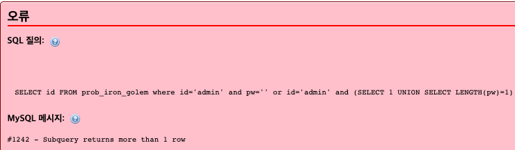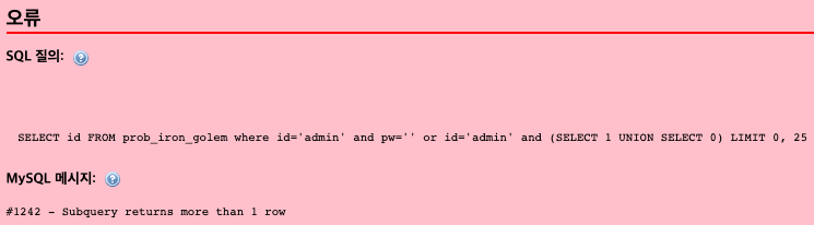 이처럼 UNION의 SELECT에 넣은 조건이 True면 1이 반환이 되면서 SELECT id FROM prob_iron_golem WHERE id='admin' and pw='' or id='admin' and 1이 될 것이며, False면 SELECT id FROM prob_iron_golem WHERE id='admin' and pw='' or id='admin' and 1, 0이 반환되면서 Error를 발생시킨다.