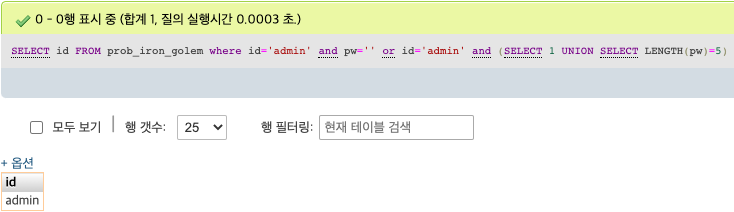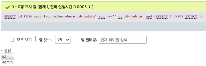 이 때는 SELECT 1 UNION SELECT 1이라서 원본 데이터와 UNION 데이터와 같아서 1만 반환이 된다.SELECT id FROM prob_iron_golem WHERE id='admin' and pw='' or id='admin' and 1이 되기 때문에 1를 True로 인식하여 쿼리의 결과가 admin이 나오게 된다.